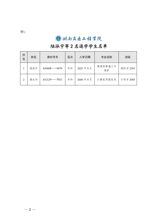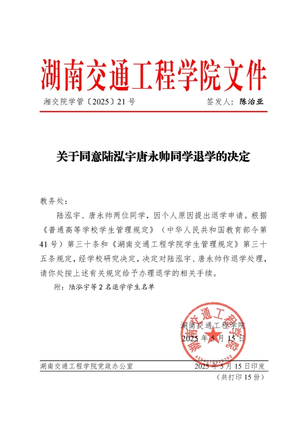 关于同意陆泓宇唐永帅同学退学的决定(湘交院学管〔2025〕21号)