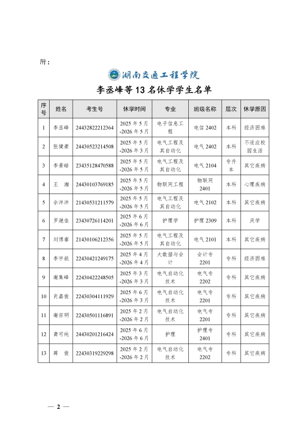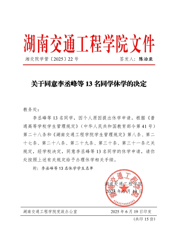 关于同意李丞峰等13名同学休学的决定(湘交院学管〔2025〕22号)