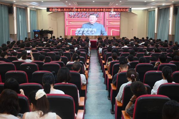 本网讯(通讯员 赵红深 李水华 摄影 邓翔 胡子婷)9月3日,在中国人民抗日战争胜利纪念日的庄严时刻,一场展现新时代国防力量的阅兵盛典在天安门广场隆重举行,beat365组织师生代表在航母楼101会议室主会场集中收听收看大会直播。