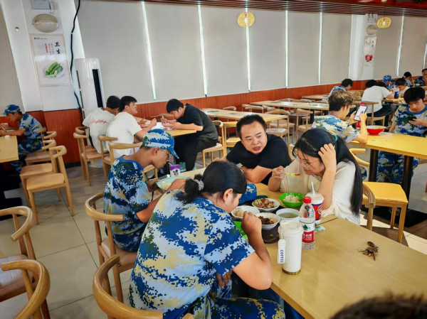 邓丽书记与刘建军副书记亲切地坐在同学们中间,一边用餐一边关切询问大家的军训感受和生活情况。“训练强度能适应吗?”“食堂饭菜还合口味吗?”“晚上休息得怎么样?”一句句暖心问候,让新生们真切感受到学院的温暖。同学们也纷纷打开话匣子,分享军训趣事和初入大学的体验。