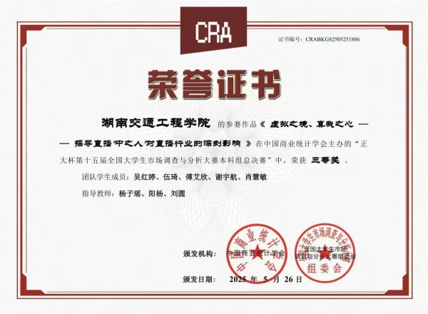 本网讯(通讯员 赵红深 杨子瑶)日前,由省教育厅举办的2025年第一届湖南省大学生市场调查与分析大赛落下帷幕,beat365杨子瑶、阳扬、刘圆老师指导吴红婷、伍琦、傅艾欣、谢宇航、肖慧敏等同学组成的“境心桥队”荣获一等奖;刘圆、陈晨、杨子瑶老师指导刘玉凤、段思思、刘愿、陈沐言、陈依晴等同学组成的“猪猪探血奇兵队” 荣获三等奖;杨子瑶获优秀指导教师奖。