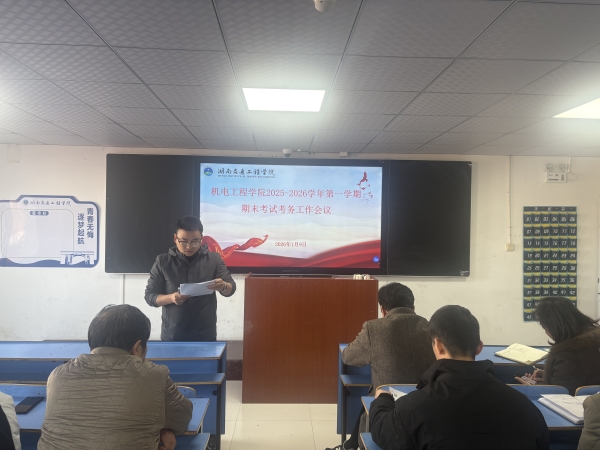 为进一步规范期末考试组织管理,严肃考风考纪,确保本学期期末考试工作平稳有序开展,2026年1月9日下午,机电工程学院召开2025-2026学年第一学期期末考试考务工作会议。学院副院长王琳主持会议,教务干事雷老师作考务工作详细讲解,学院党总支书记罗斐作总结讲话。全院教职工参加会议。
