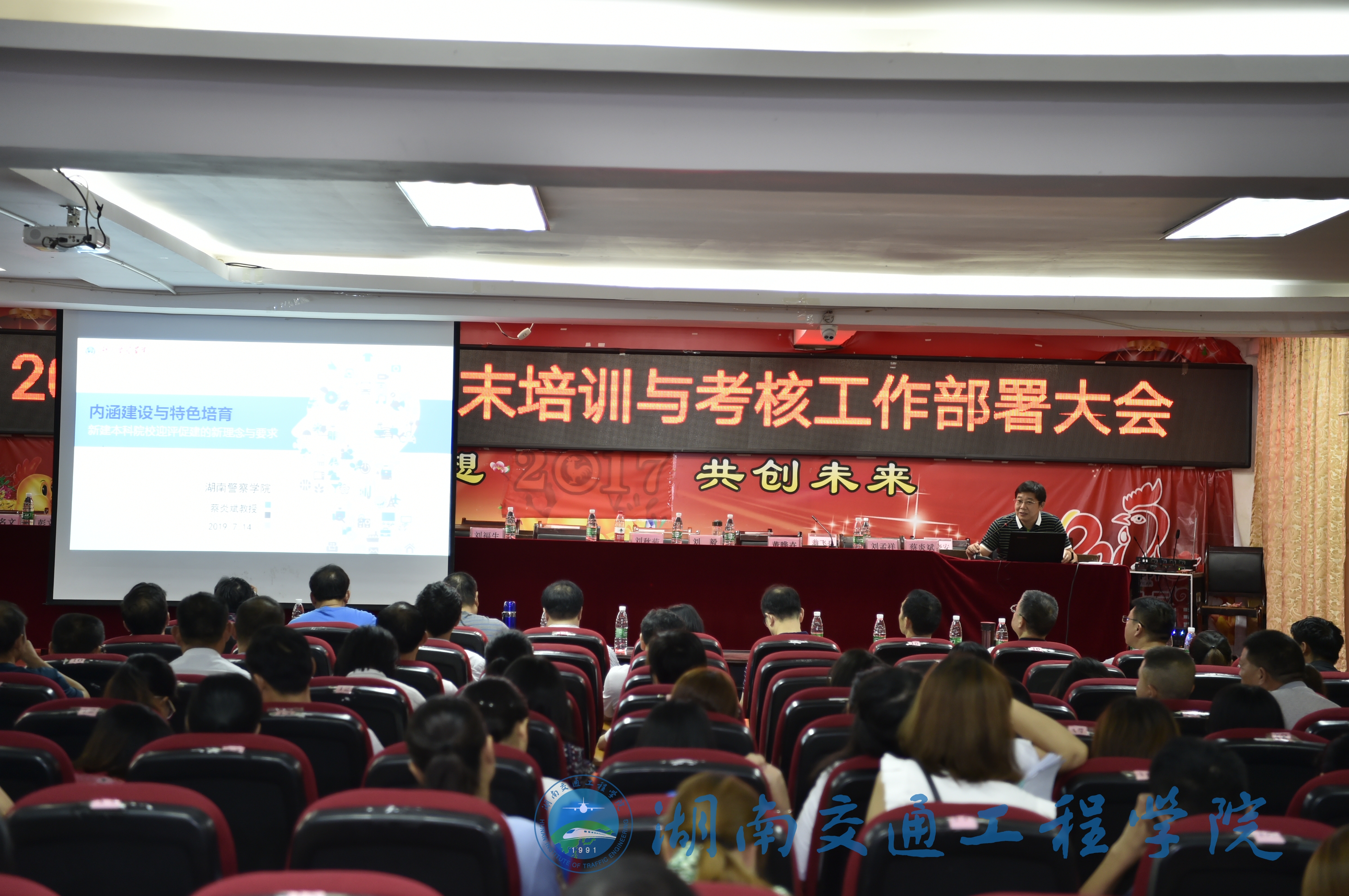 本网讯(记者李建华 摄影李杰)7月14日上午,beat3652019年上学期期末培训与考核工作部署大会在体育馆101会议大厅举行,河南理工大学原副校长、教育部评建专家王裕清教授,湖南警察学院校长助理、评建办主任蔡炎斌教授应邀作本科教学合格评估工作专题讲座。全体在校领导、14名知名大学资深专家出席大会并在主席台就座。各职能处室、二级学院负责人及全体教职员工参加大会。大会由副董事长、第一副校长刘杰主持。