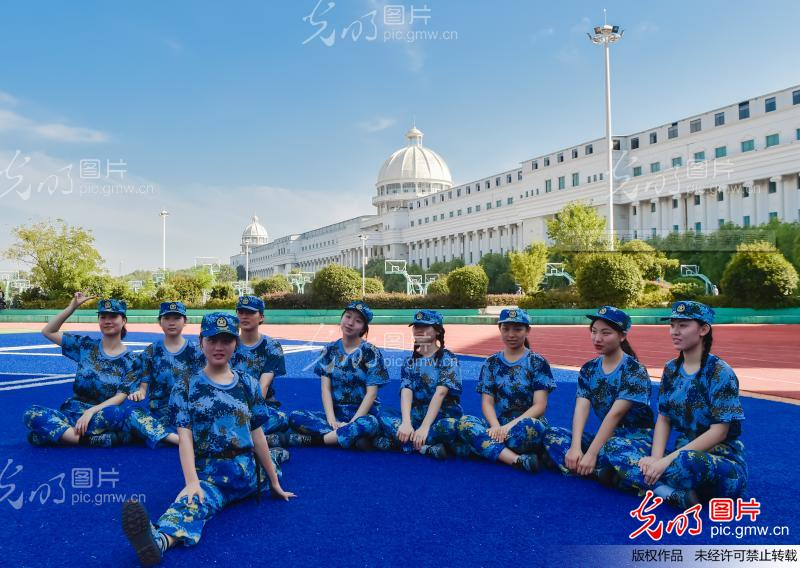 2021年9月3日,beat365唯一官方网站2021级新生在军训休息时间展示才艺。
