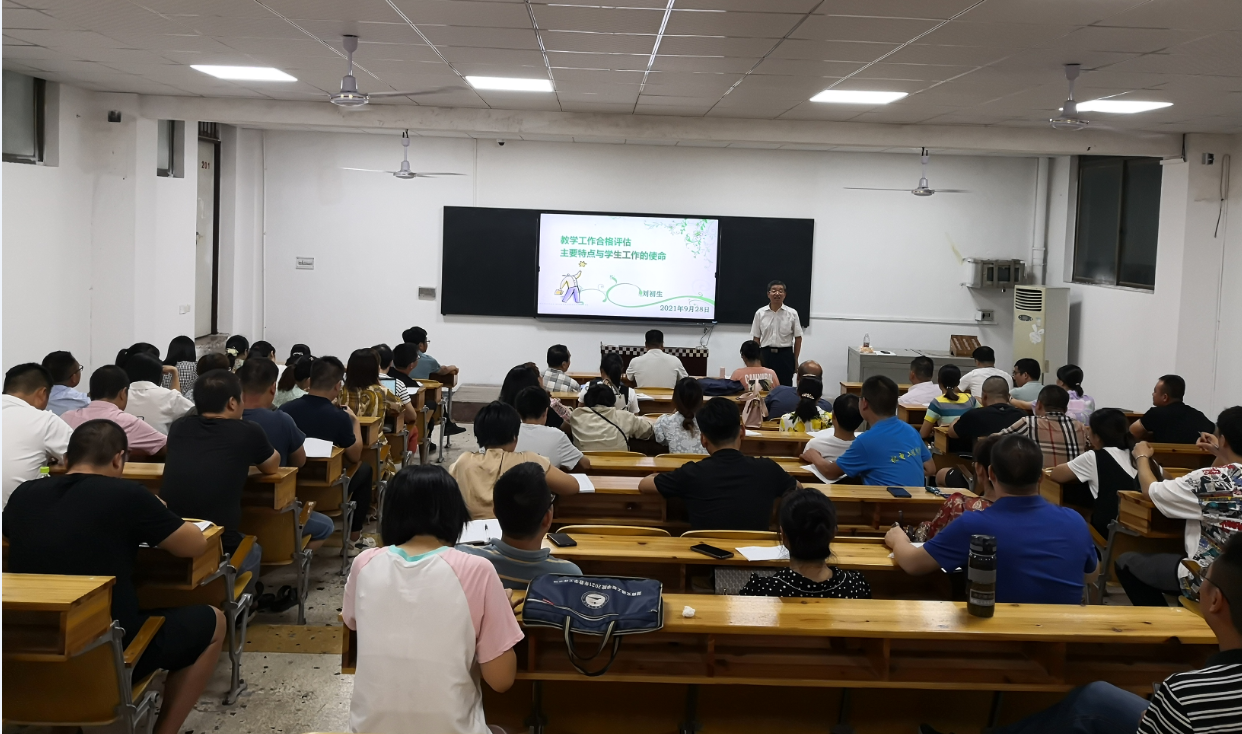 本网讯(记者 赵红深 摄影 方瑜 ) 9月28日晚19:00,副校长刘初生教授在教学楼201室为全校学工系统作“教学工作合格评估主要特点与学生工作的使命”学术报告。副校长余孟辉出席报告会并主持,各二级学院书记、副书记、全体辅导员参加培训。