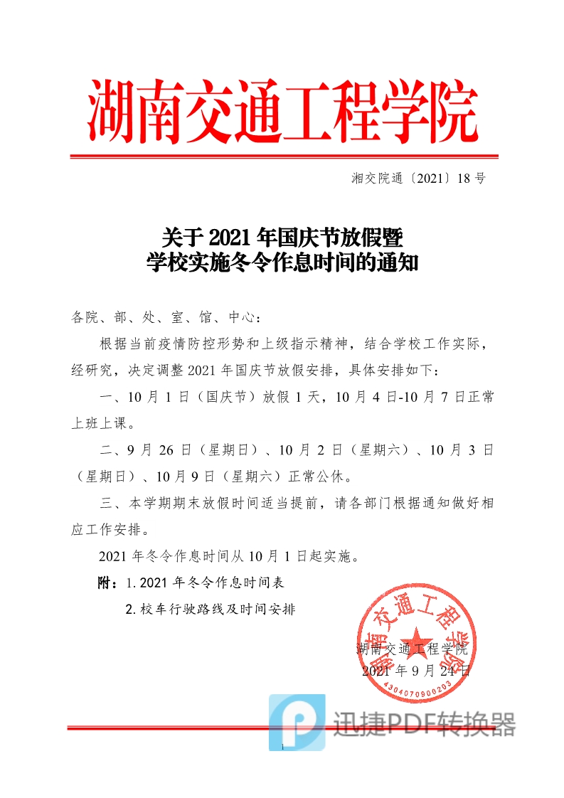 关于2021年国庆节放假暨学校实施冬令作息时间的通知