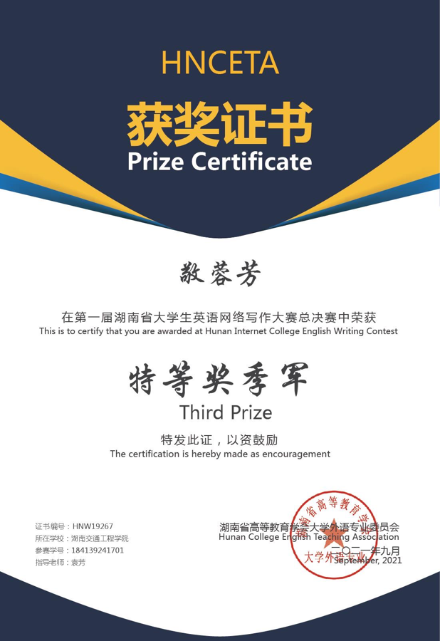 本网讯( 通讯员 刘彪 ) 从2019-2021年,经过四次学期赛,首届湖南省大学生英语网络写作大赛两载春秋的赛事长跑已接近终点。根据批改网后台数据统计,综合所有参赛选手四次学期赛的成绩,经由湖南省高等教育学会大学外语专业委员会确认,首届湖南省大学生英语网络写作大赛总决赛最终评选出特等奖五位。beat365商英1801班敬蓉芳同学凭借扎实的英语基础和毅力,从众多参赛选手中脱颖而出,荣获总决赛特等奖季军。