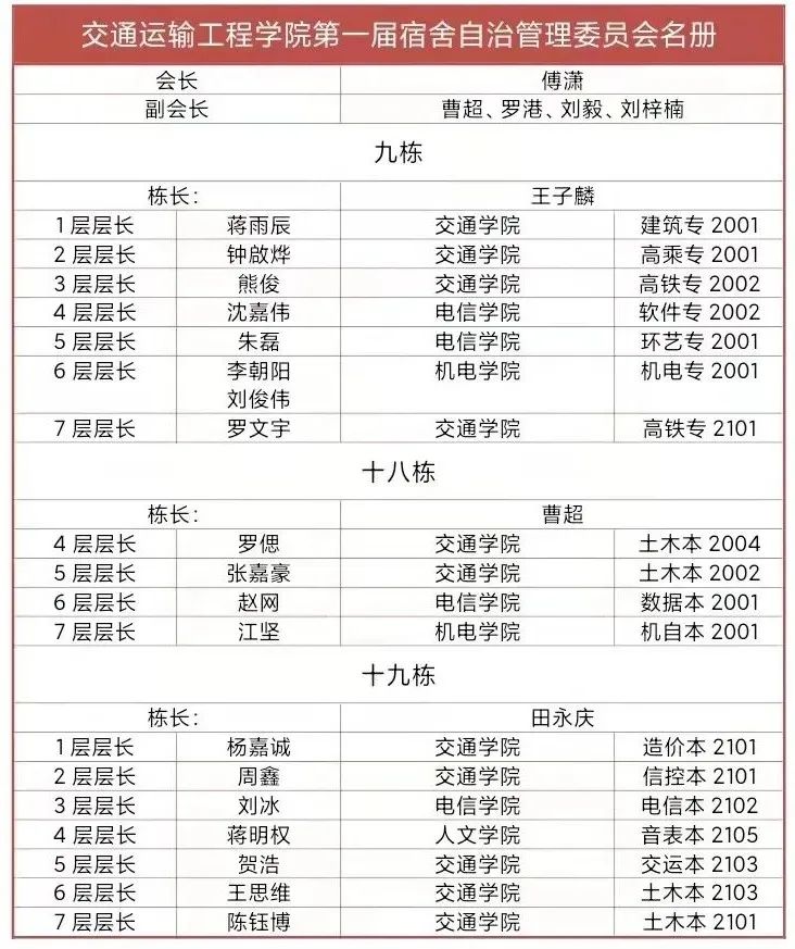 导语:学生宿舍自治管理委员会由院学生会宿管部成员、栋长、层长、寝室长及先进学生代表组成,负责参与学生宿舍管理事宜。组织学生认真执行学院关于宿舍管理的各项条例、办法、规定、制度。每栋宿舍楼成立学生自治管理小组,负责本楼的学生宿舍管理事宜。每个寝室设寝室长1名,每层设层长1-4名,每个楼栋设栋长1名。
