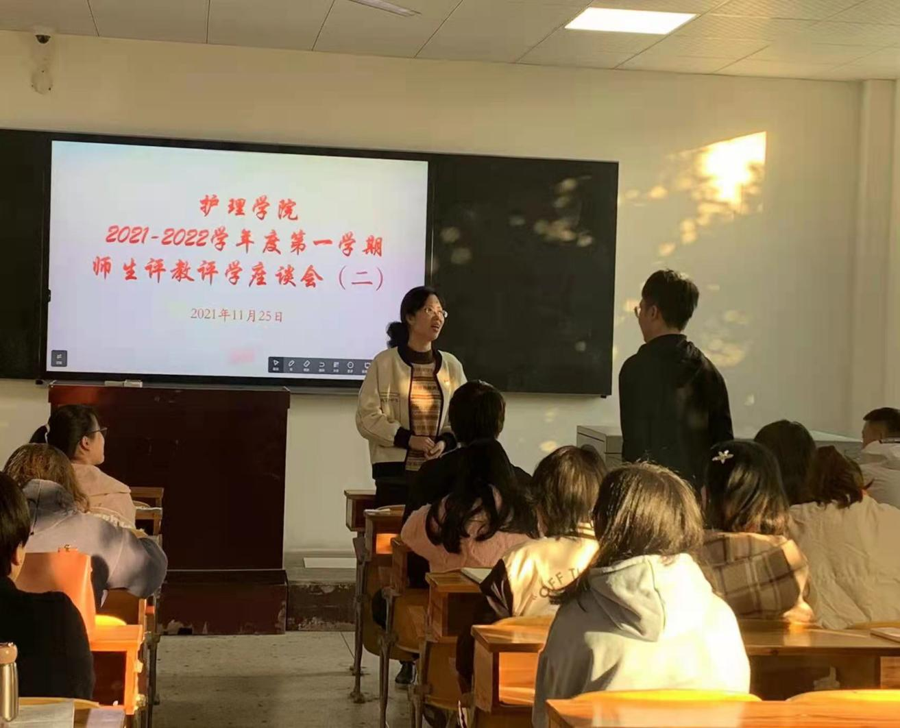 为稳步提高学院教学质量,融洽师生关系,使教学工作更上一个台阶,按照学院教学工作部署,11月25日下午16:30,护理学院在教学楼103、104、105教室分年级召开2021-2022学年度第一学期评教评学师生座谈会。学院行管干部、教师代表、各班学生代表参加座谈,会议由学院书记邓丽、副院长吴端生,副书记肖桂香分别在各教室主持。