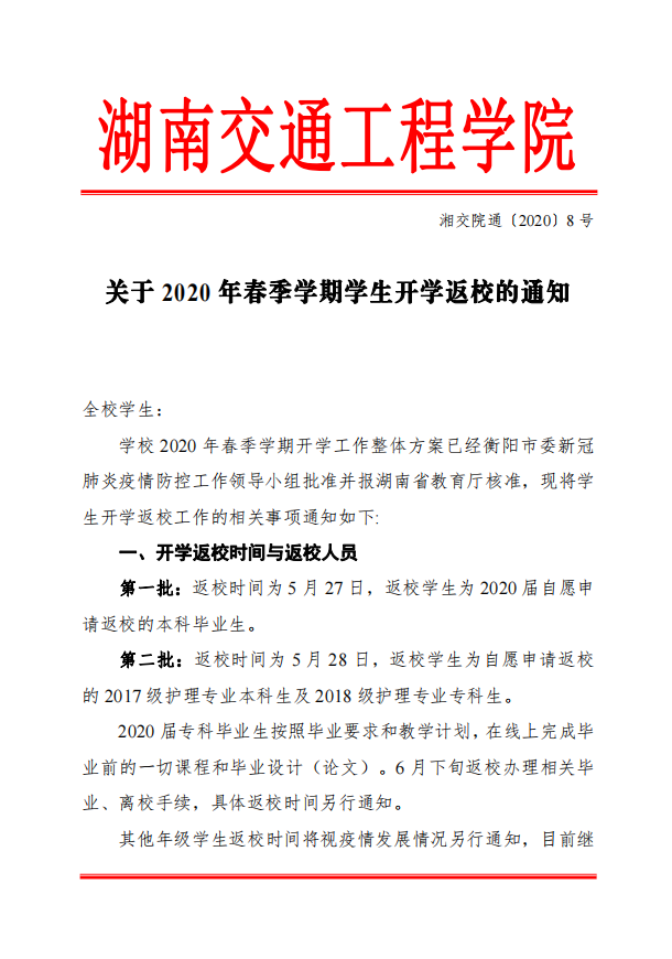 关于2020年春季学期学生开学返校的通知
