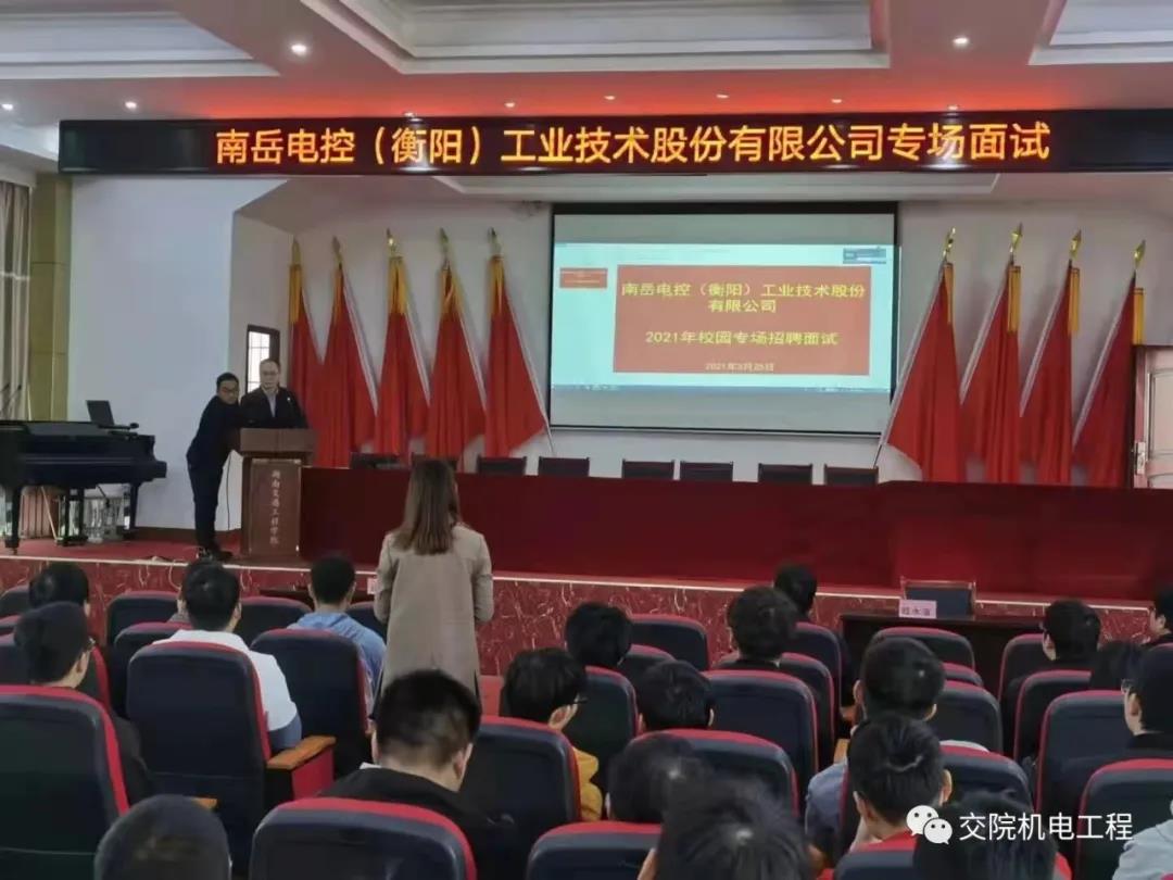 3月25号,南岳电控(衡阳)工业技术股份有限公司到beat365体育馆101会议室举行宣传会并开展专场招聘,beat3652017级机电工程、交通工程、高铁技术、电信和电气等专业共500余名2021届毕业生聆听了宣讲会。