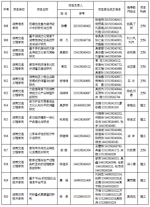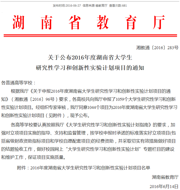 关于公布2016年度湖南省大学生研究性学习和创新性实验计划项目的通知