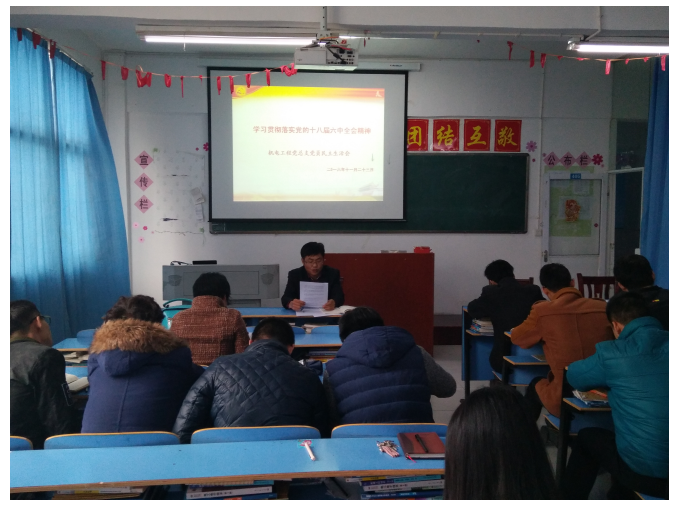 11月23日下午我院党总支组织全体党员在机电楼405举行党员民主生活会,学习贯彻落实中国共产党十八届六中全会会议精神。会上,罗斐书记介绍了十八届六中全会召开的相关情况,带领大家共同学习了《中国共产党第十八届中央委员会第六次全体会议公报》。他指出,学习党的十八届六中全会精神,就要深刻认识党的十八届六中全会精神的重大意义,切实增强全面从严治党的自觉性和坚定性;要深刻理解全面从严治党的鲜明主题。
