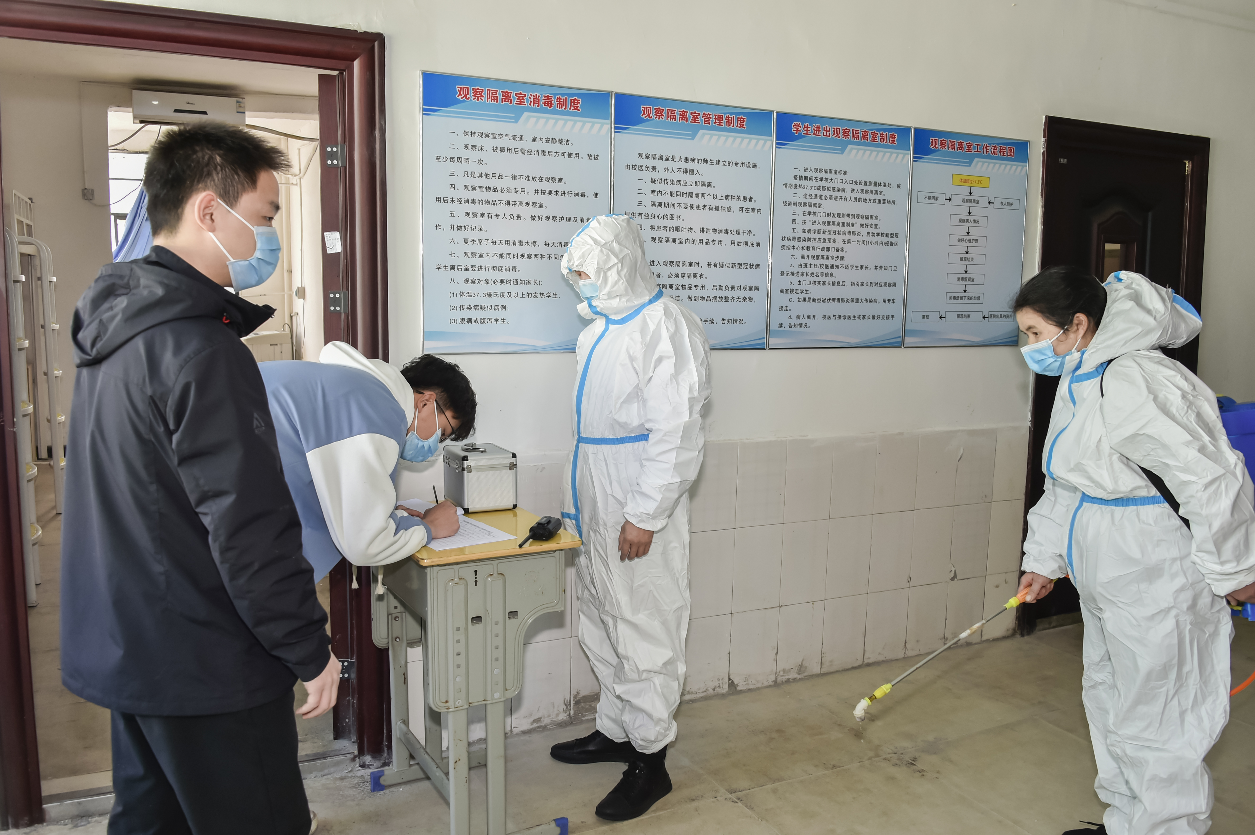 场景二15栋学生宿舍内:以一名学生晨检时发热为背景,模拟了逐级报告、启动预案诊疗、转送发热学生至南华大学附二医院发热门诊检查、学校隔离区接收学生的全过程。