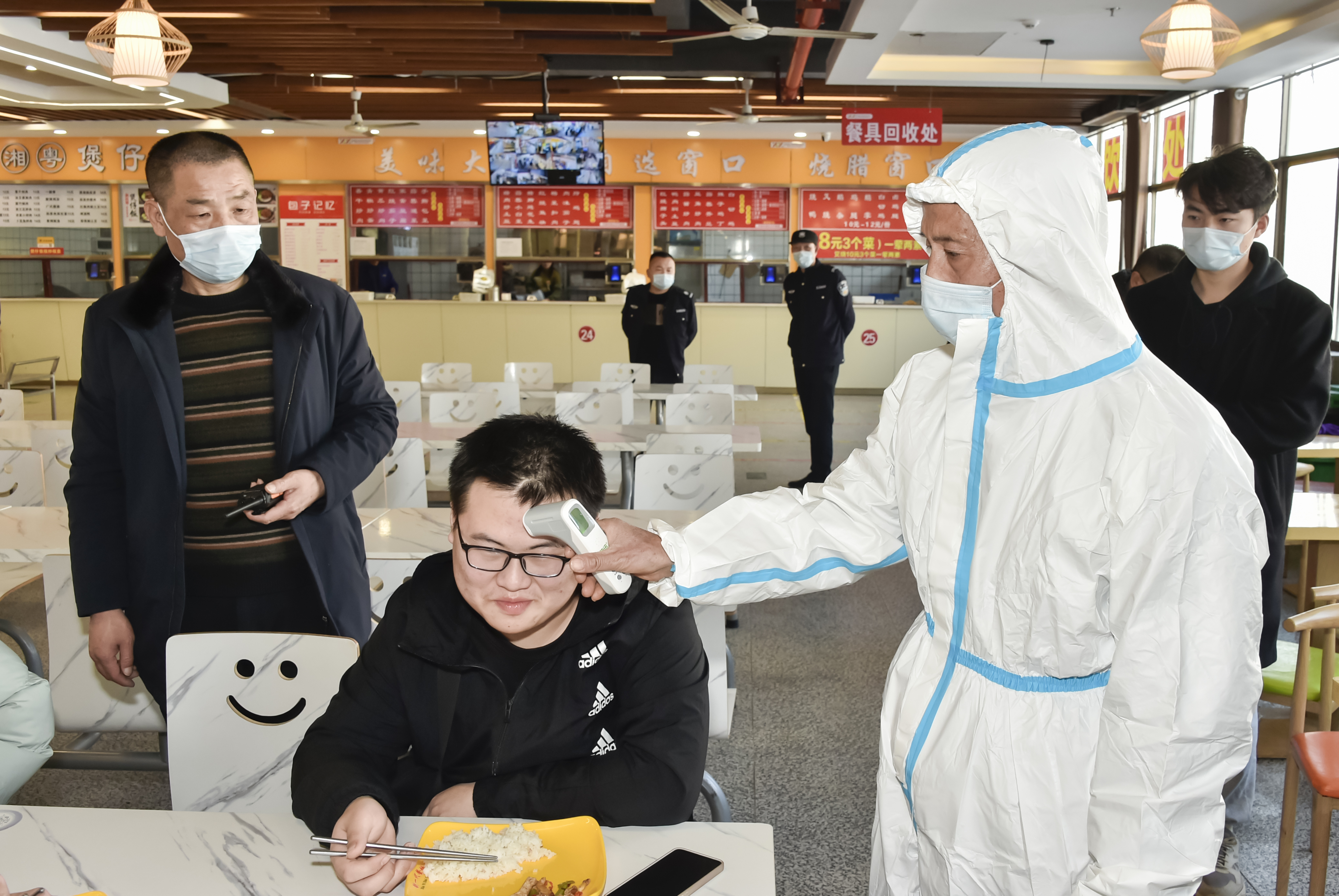 场景三一食堂:食品安全委员会巡查员以发现正在就餐的A学生精神不佳,并偶有干咳、流鼻涕等症状为背景,模拟了立即报告应急救治处置组,处置组立即将A同学带到隔离区,校医在隔离区再次进行体温确认后,报告指挥长并转市属医院。指挥长带领秩序保卫组立即进入食堂就餐厅,稳定餐厅秩序,同时做好就餐厅其他学生的心理安抚,做好食堂就餐庁的通风工作,并应急救治处置组将现场就餐学生引导至学校隔离观察室,消毒组立即对食堂就餐厅进行全面消毒。