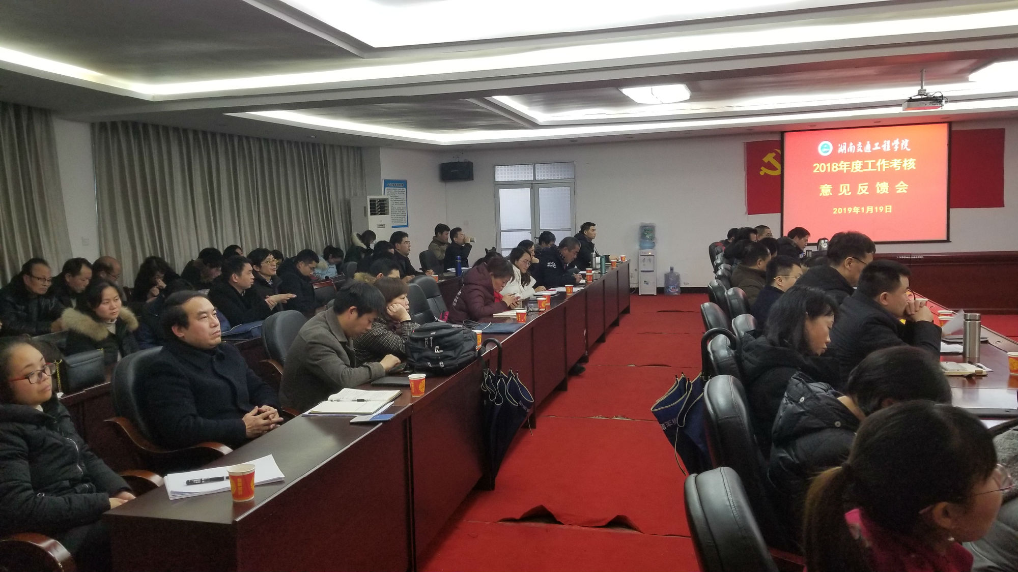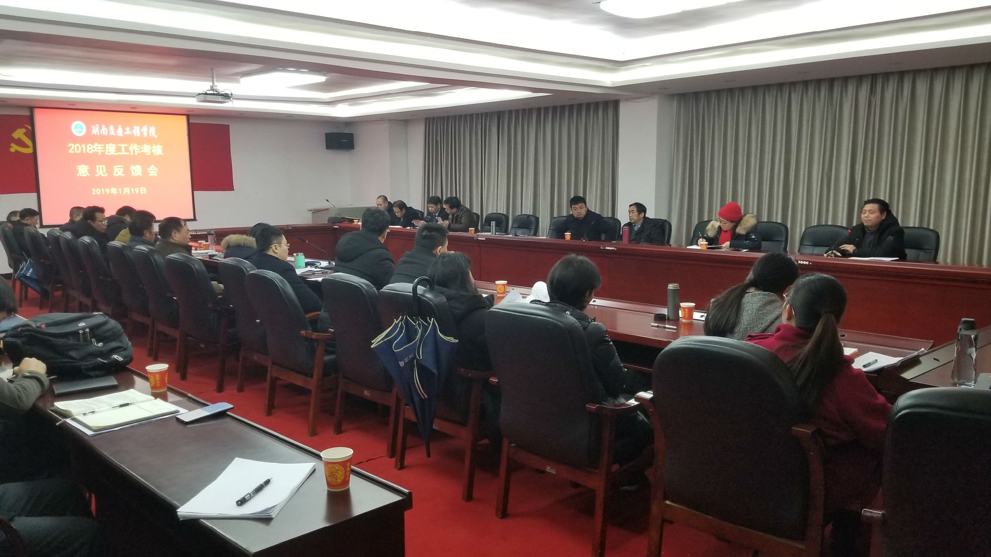 学校2018年度工作考核意见反馈会在体育馆103会议室召