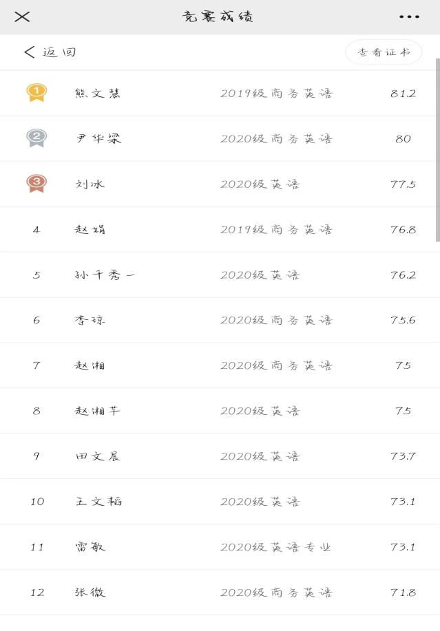 据悉,正式比赛前“词达人”公众号开通了考试加油包、免费思政词汇学习和一次赛前模拟考试,为各位考试提供了充足的备考资源。beat365考生积极备考,认真参考。据统计,beat365有来自英语、商务英语、软件工程、国际经贸等8个专业的435名考生参加,冠军得主为2019级商务英语熊文慧,分数为81.2分。这次比赛加强了对大家的思政教育,锻炼了同学们的应考能力。最后祝贺本届“外教社·词达人杯”校赛完美落幕。