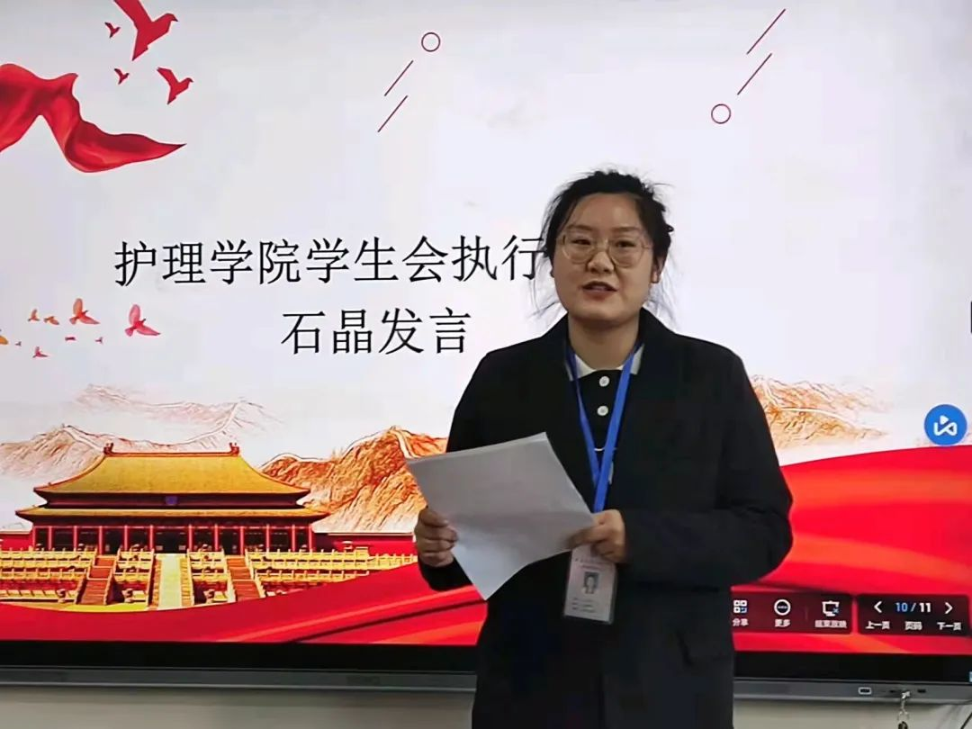 随后护理学院学生会主席团代表朱宏健、管理组代表、各部门新干、执行主席石晶进行发言,执行主席石晶就近期学生会存在的问题进行了指正。