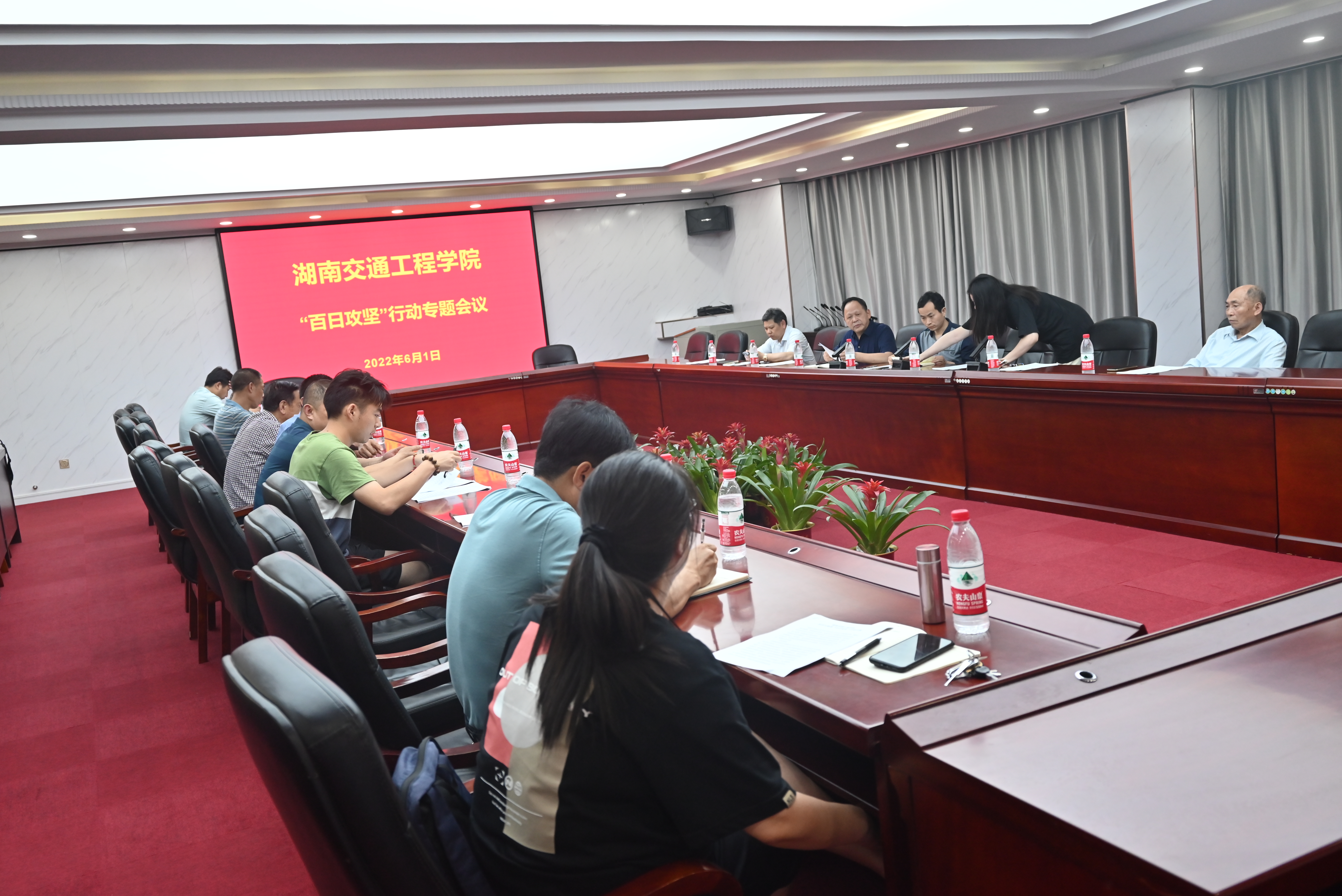 本网讯(记者 摄影 赵红深)6月1日下午,学校在体育馆103会议室召开校园安全大检查“百日攻坚”行动动员部署会,党委书记刘文君出席会议并讲话,副书记李先聪、常务副校长彭文武、副校长余孟辉出席,余孟辉主持。