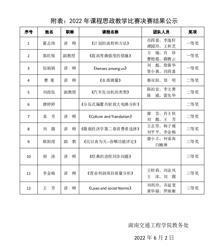 根据湖南省教育厅《关于举办2022年湖南省普通高校课程思政教学竞赛的通知》和《关于举办beat365唯一官方网站课程思政教学比赛的通知》(湘交院教[2022]32号)的要求,学校进行了教师课程思政教学竞赛决赛。根据学校决赛评审专家组集体评议,分别推荐出一等奖3项、二等奖4项、三等奖5项,具体名单详见附表。其中获奖者分别推荐参加湖南省文科组(霍志玮、刘圆)、理科组(郭红铄、曹果)和外语组(伍娟娟、袁芳)决赛。