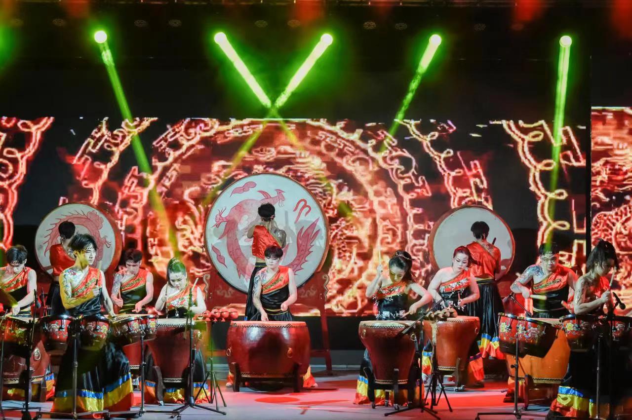 打击乐团表演的《龙腾虎跃》,主题旋律与鼓声交相奏鸣、震撼人心,渲染了气势壮阔的欢腾场面,表现了人们龙腾虎跃,奋勇前进的风貌。