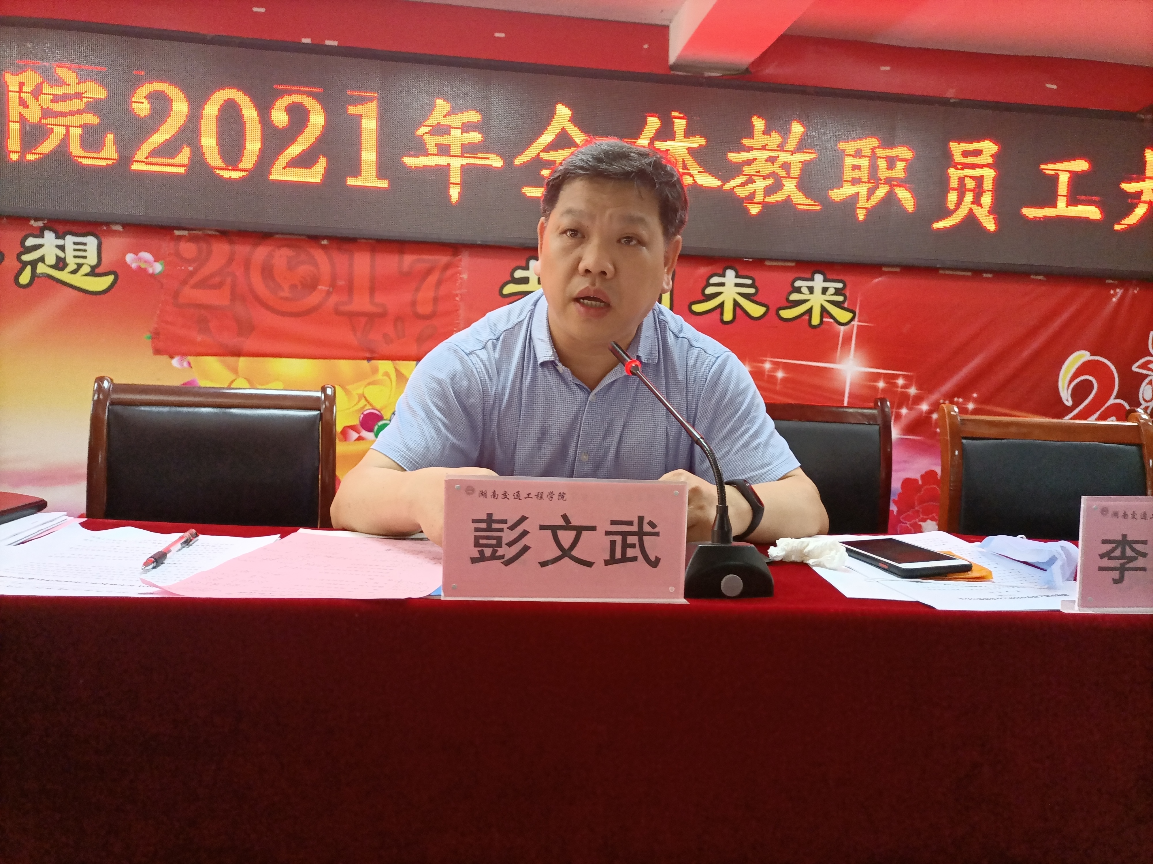 彭文武在主持会议中指出,校长的报告主题明确、内容丰富,针对性很强,为我们今后一段时期的工作指明了方向。广大教职员工的快乐幸福与学校的发展息息相关, 学校是我们的命运共同体。合格评估迎评促建工作现己进入关键时刻,大家务必增强忧患意识,全面审视各自的工作,实事求是地找差距、查短板、寻弱项,加快补齐短板、扩大优势。彭文武强调,本次会议进一步增强了广大教职工做好工作的信心和勇气,对做好今后一个时期工作具有很强的指导意义。各行政处室、各二级学院要认真组织学习讨论陈校长的报告和董事长的讲话精神,围绕学校发展大局,主动思考,积极作为,为推进迎评促建进程和“双一流”建设作出更大的贡献。