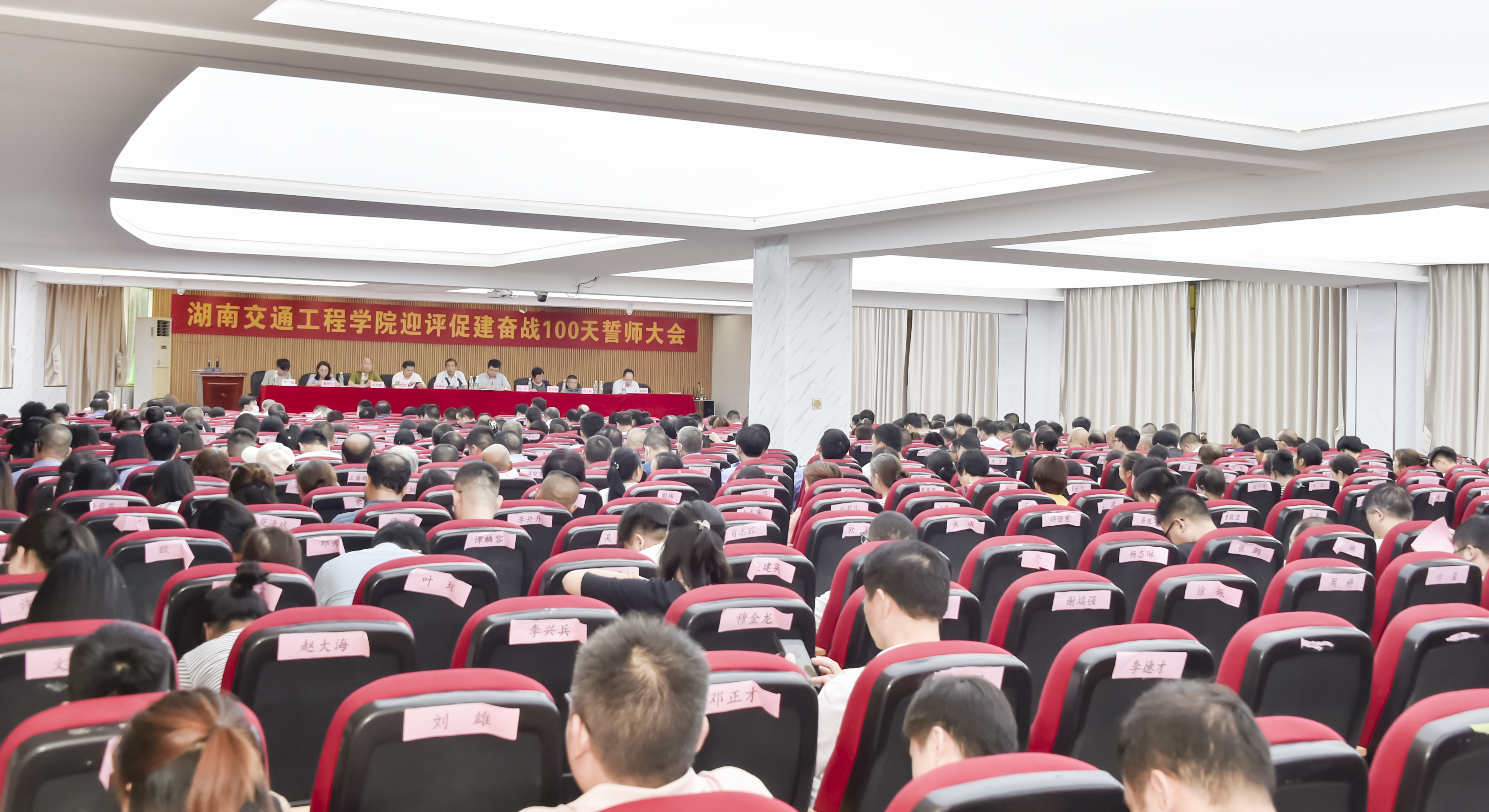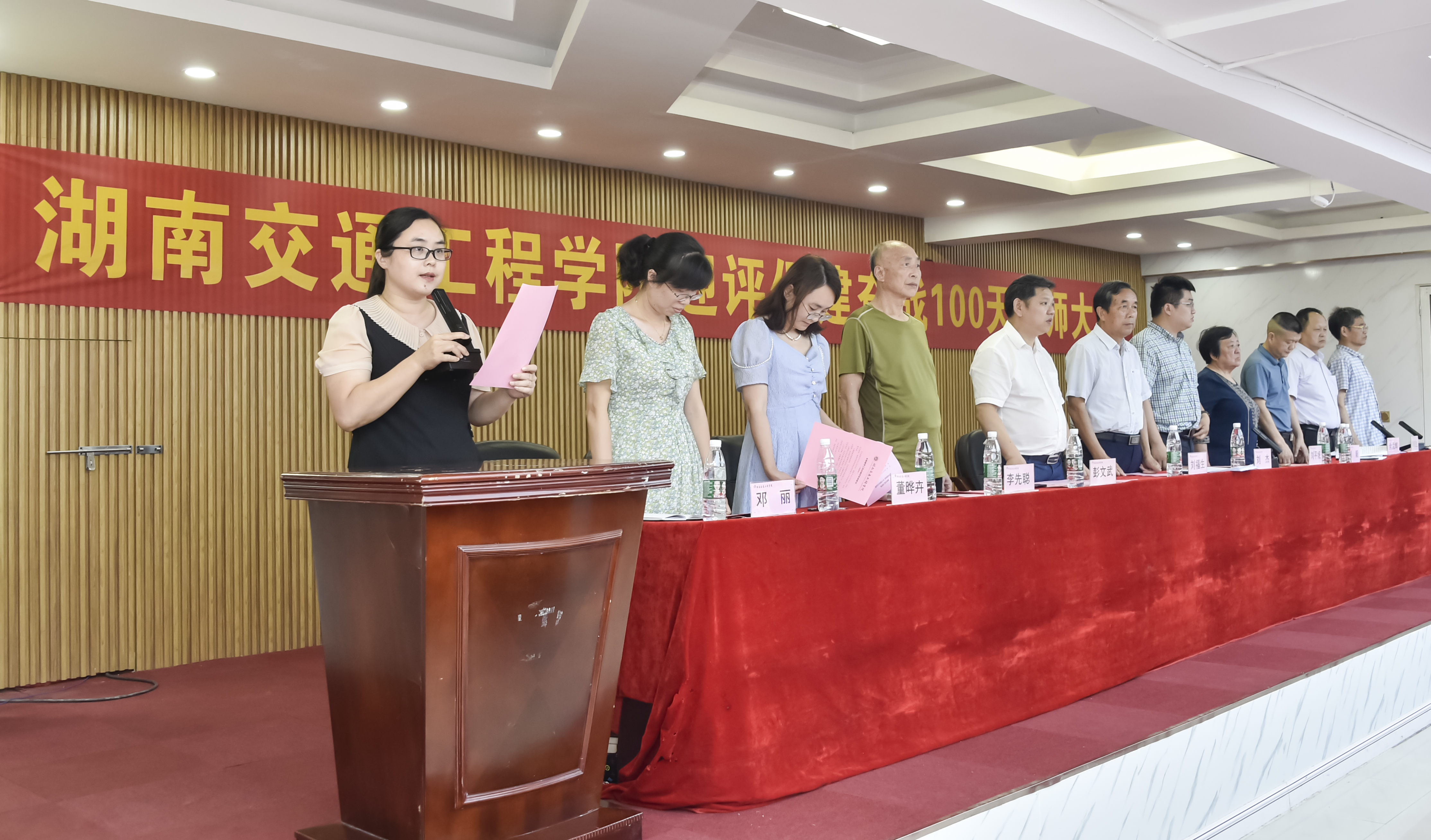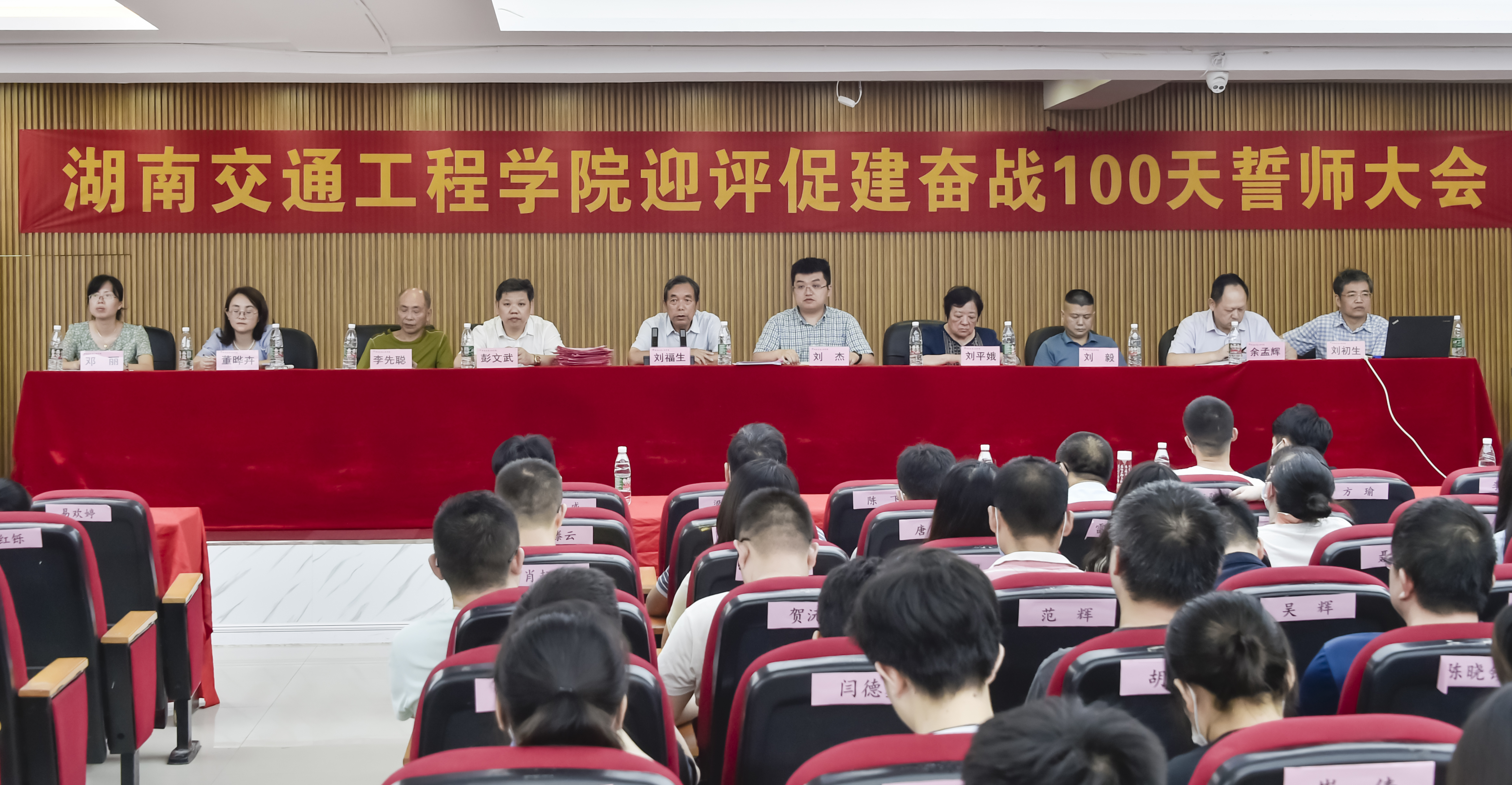 董事长刘福生代表校董事会宣读并向学校递交《本科教学工作合格评估承诺书》;副董事长、执行校长刘杰领衔校领导宣读并向学校递交《本科教学工作合格评估承诺书》;交通运输工程学院院长罗迎社领衔二级学院院长、书记宣读并向学校递交《本科教学工作合格评估承诺书》;质评中心主任肖珍领衔中层干部宣读并向学校递交《本科教学工作合格评估承诺书》;经济管理学院教师代表许芳领衔教师宣读并向学校递交《本科教学工作合格评估承诺书》;护理学院廖小立老师领衔管理人员和辅导员宣读并向学校递交《本科教学工作合格评估承诺书》;后勤处长刘国祥领衔工勤人员宣读并向学校递交《本科教学工作合格评估承诺书》。