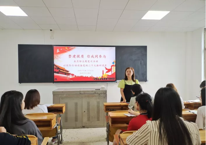 为以实际行动迎接党的二十大的顺利召开护理学院党总支于528日上午在教学楼104教室召开了以整建提质你我同参与为主题的五月份主题党日活动参加此次会议的有护理学院党总支书记邓丽团总支书记兼党总支副书记肖桂香教工党支部书记周艳平学生党支部书记贺九芳14栋临时党支部书记刘梯全体教师学生党员