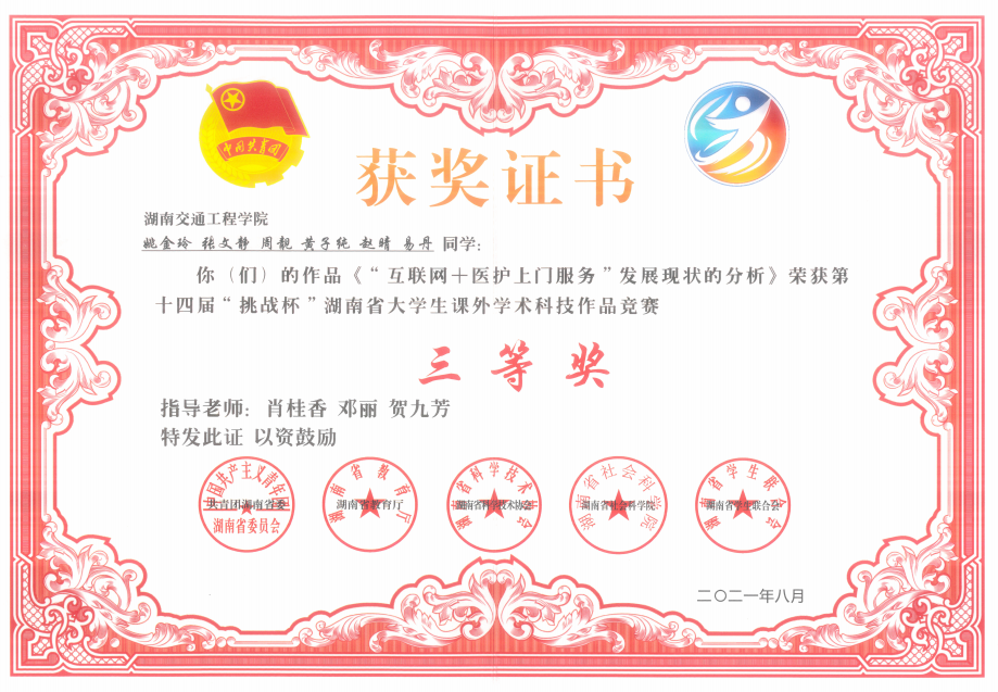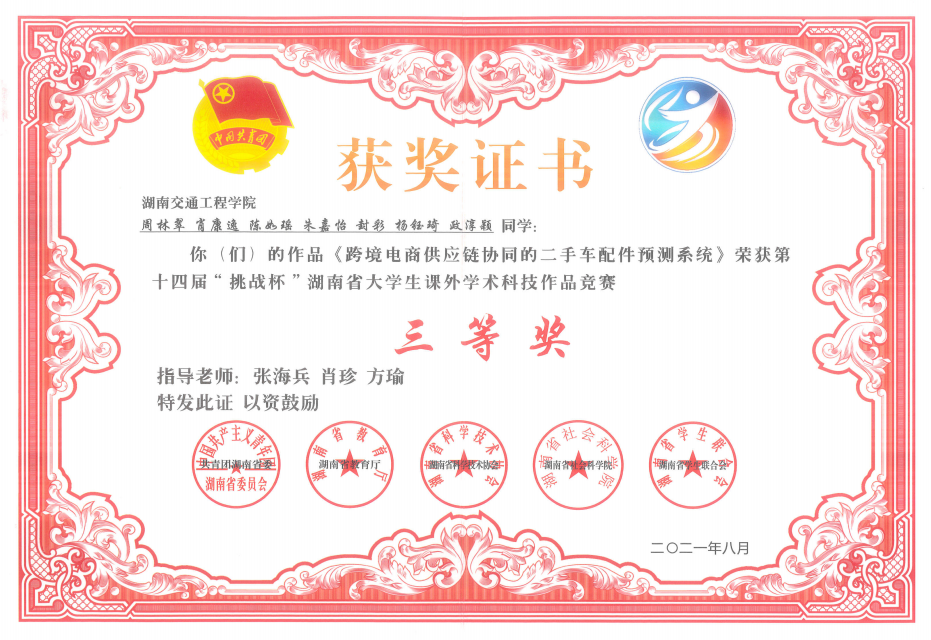 beat365获得2021年第十四届“挑战杯“湖南省大学生课外学术科技作品竞赛5个奖项