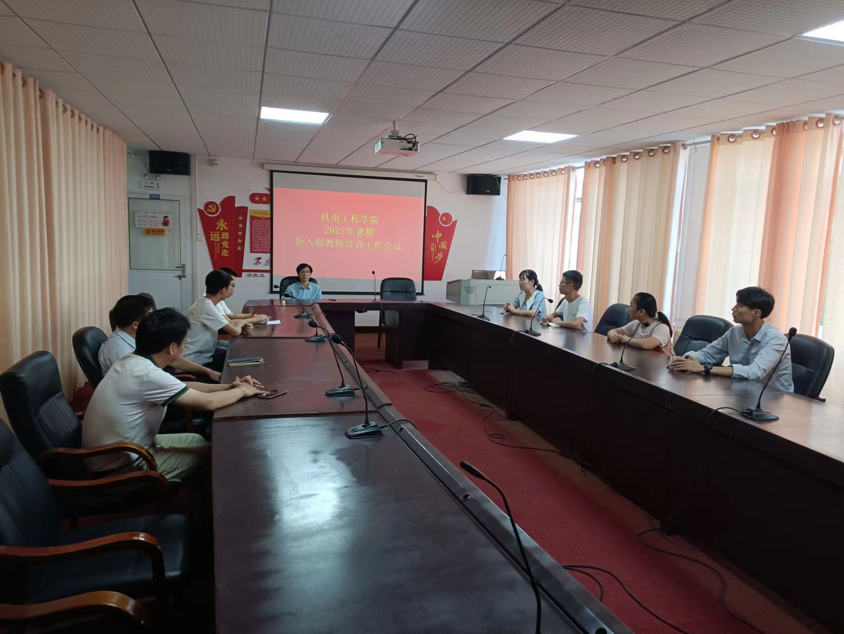 本网讯(记者  摄影 范辉为了让新教师更好更快地投入到新的工作岗位中,8月2日上午,2022年新教师培训会在机电工程学院会议室召开,会议由陈威老师主持,出席会议人员有教学院长杨启正,教务干事殷文英、雷勋伟及新入职老师。