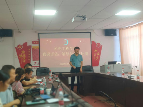 开赛前,机电工程学院党总支书记罗斐表示,全院辅导员要以“说评估”说课比赛为契机,号召全院学生要不断增强主人翁意识,以积极的姿态投身到评估工作中去,统一思想,凝聚共识,找出差距,营造出“人人了解评估,人人关心评估,人人参与评估,人人服务评估,人人为评估做贡献”的迎评氛围,为打赢学校本科教学合格评估攻坚战贡献智慧和力量,以实际行动向党的二十大献礼。