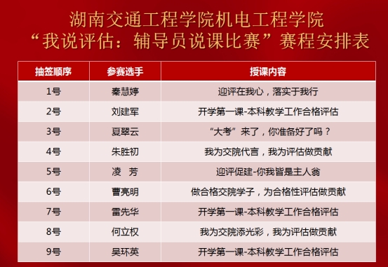 为迎接教育部本科教学工作合格评估,进一步普及评估知识,营造“人人了解评估,人人关注评估,人人会讲”的氛围,以最佳的状态迎接教育部本科教学工作合格评估。8月13日上午9点,beat365唯一官方网站机电工程学院,举办了一场别开生面的“开学第一课”——我说评估:辅导员说课比赛初赛。活动旨在积极响应学校迎接本科教学合格评估,以赛促教,以赛促学,以赛促改,以赛促建,进一步加强辅导员队伍专业化建设,充分发挥主题班会课在大学生思想政治工作中应有的作用,促进院内辅导员之间的工作交流与经验学习。