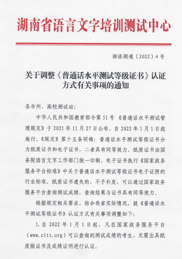 关于调整《普通话水平测试等级证书》认证方式有关事项的通知