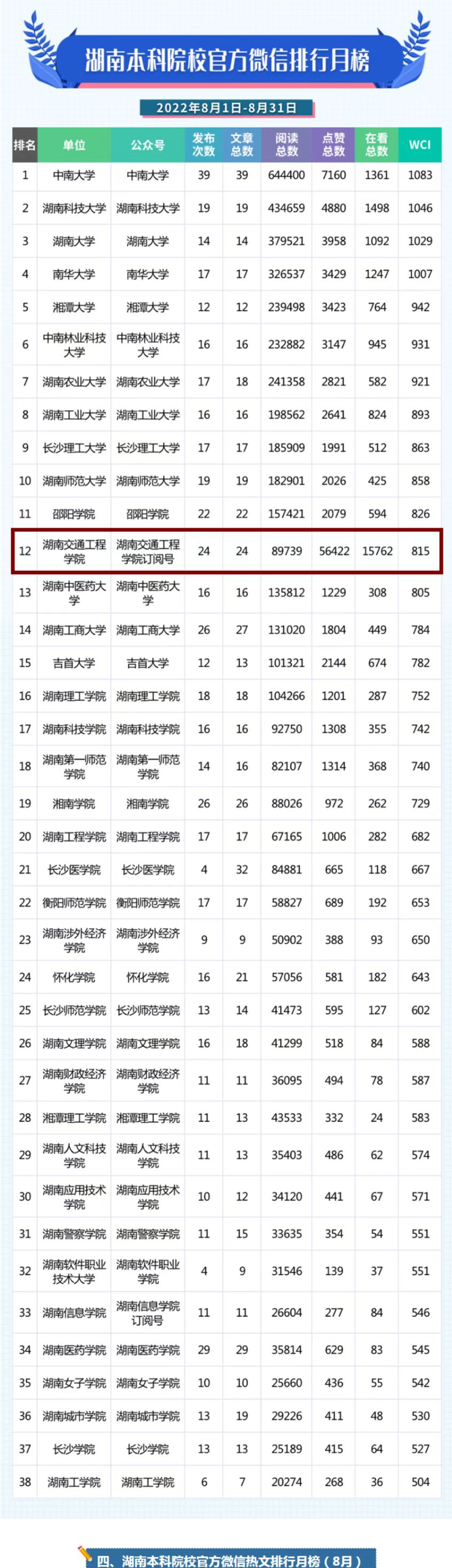 本网讯(记者 赵红深)8月,beat365官方微信订阅号共发文24次,推文24篇;文章阅读总数89739,点赞总数56422(6月37906),相比7月增加48.85%,排全省38所本科高校第1;在看总数15762(6月12156),相比7月增加29.66%,排全省38所本科高校第1;帐号WCI值保持800以上,排全省38所本科高校第12。beat365官方微信传播力和影响力在全省本科高校中排名稳定在第一方阵。