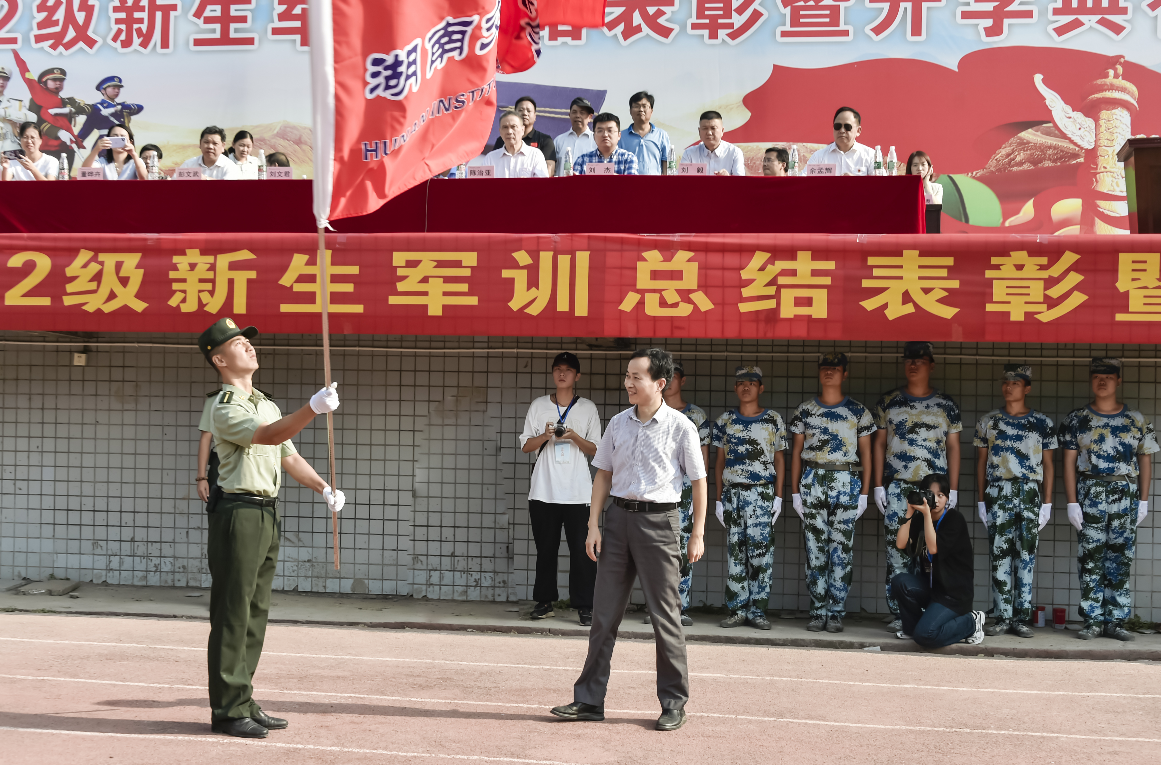 本网讯(记者 赵红深,摄影 李建华)金秋九月,秋高气爽,丹桂飘香。经过19天的艰苦训练,2022级新生圆满完成了军训任务。9月17日上午,学校在田径运动场隆重举行2022级新生军训成果汇报表彰大会暨开学典礼。董事长刘福生、校长陈治亚、党委书记刘文君、执行校长刘杰、常务副校长彭文武、纪委书记刘毅、副校长余孟辉、董事董晔卉、党委委员邓丽出席。相关职能处室负责人,各二级学院院长、党总支书记(副书记),全体教官、辅导员和教师代表以及近4000名2022级新生参加了典礼。典礼由刘杰主持。