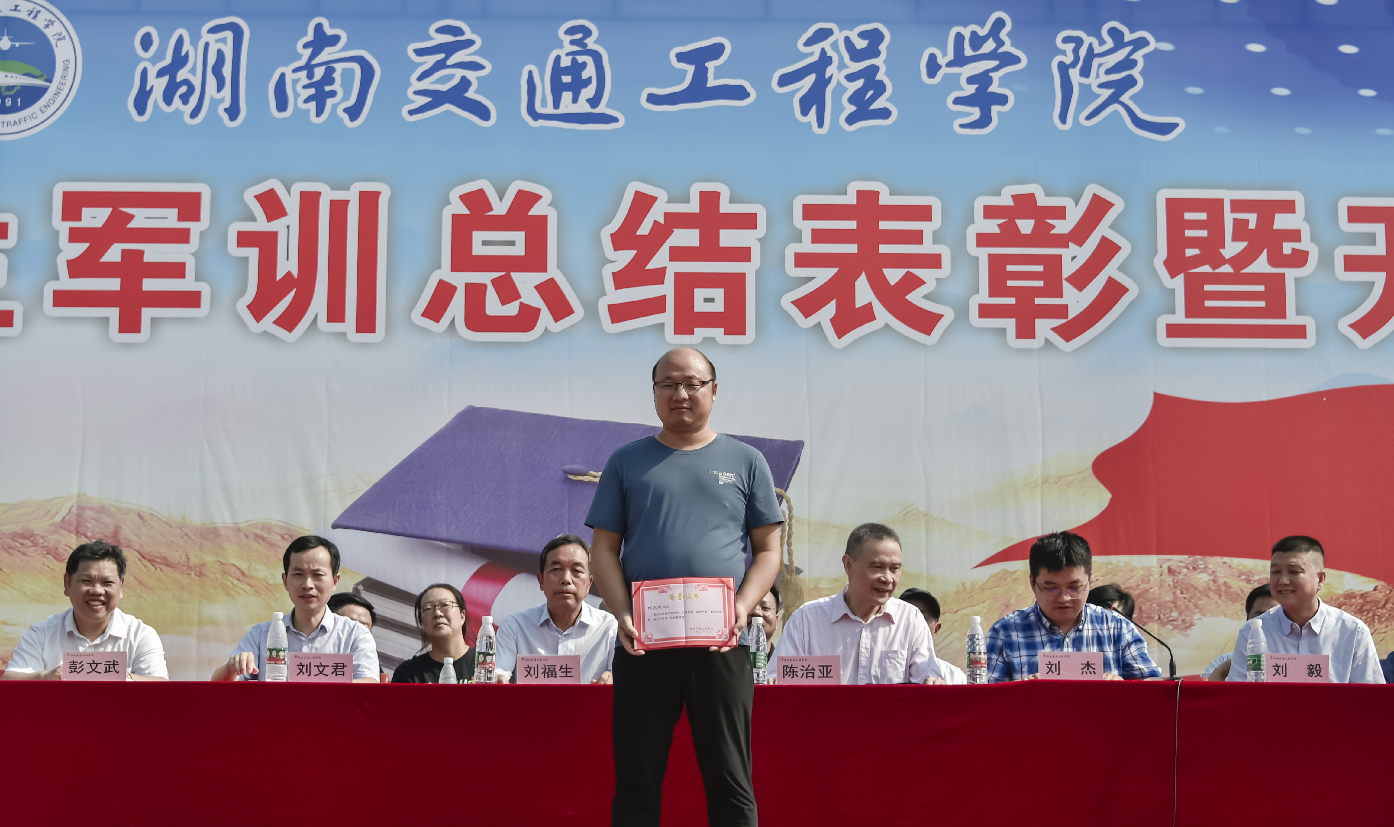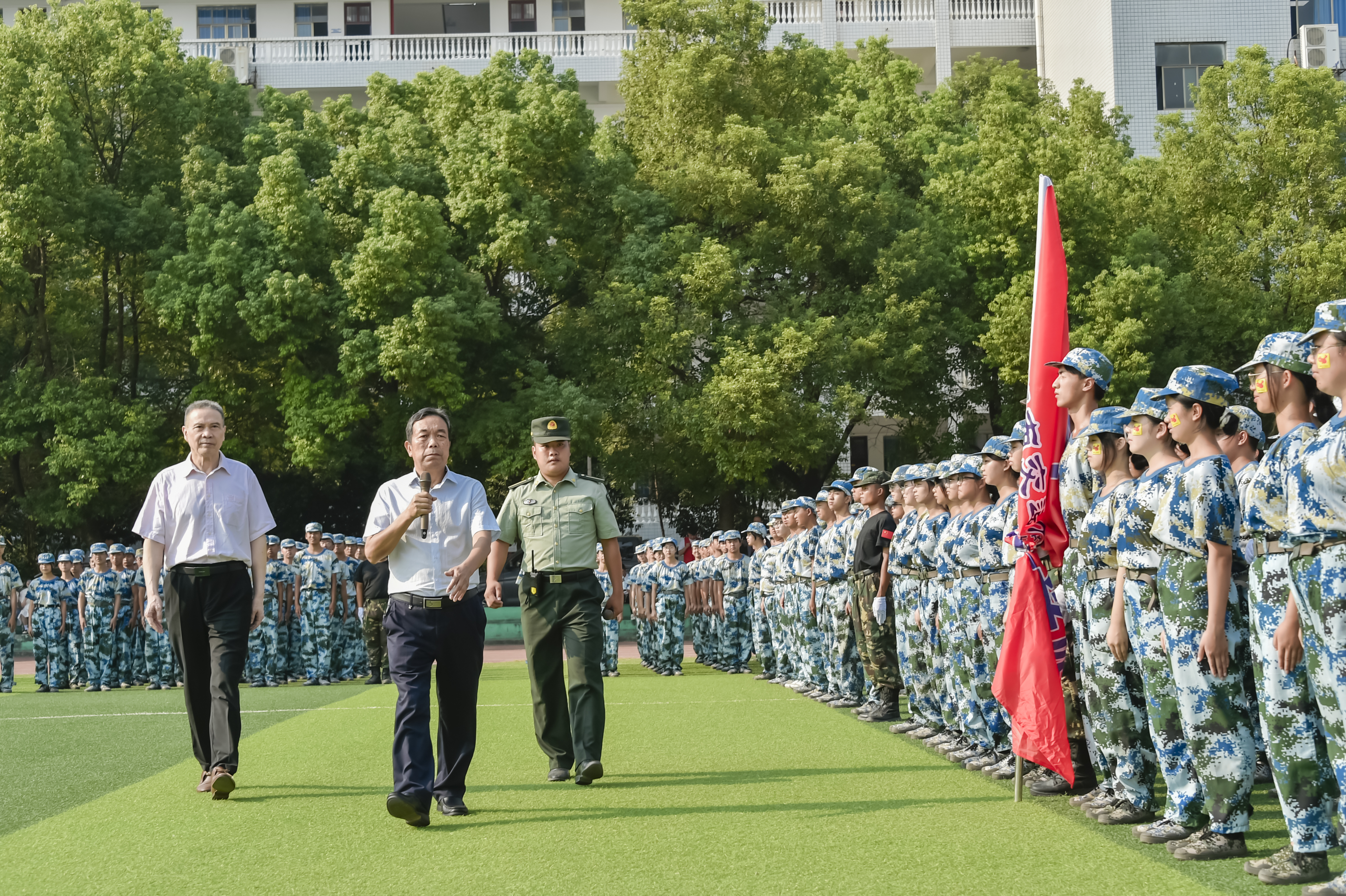 军训汇报大会暨开学典礼在庄严肃穆的国歌声中拉开帷幕。首先进行了军训会操。刘文君给老兵连授校旗后,刘福生检阅了军训团。伴随着雄壮的进行曲,在陈治亚、军训总教官吴桐港的陪同下,刘福生逐一检阅各学院方阵。“同学们好!”“董事长好!”“同学们辛苦了!”“为校争光!”阵阵气势如虹的口号声在操场上空久久回荡。