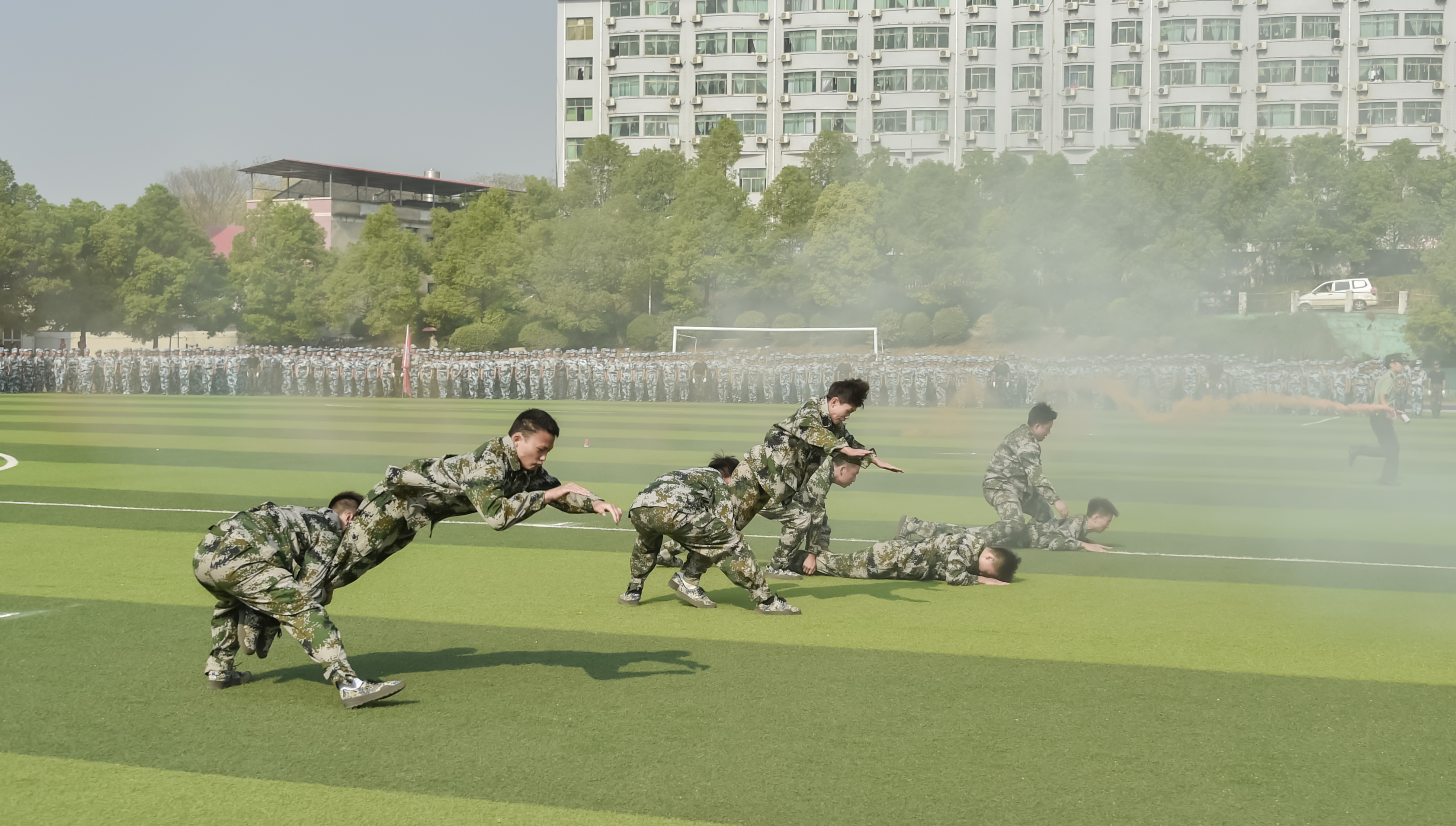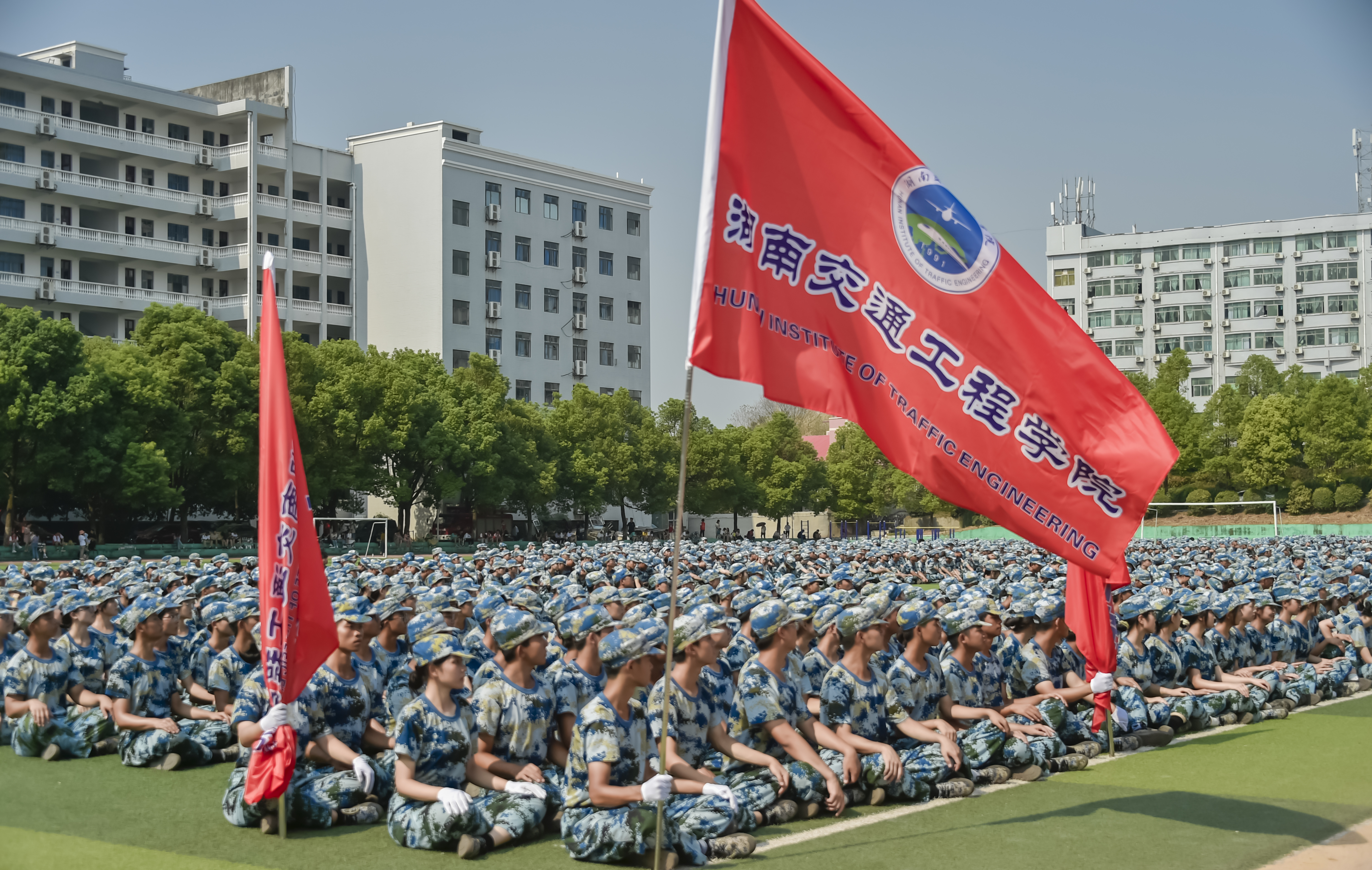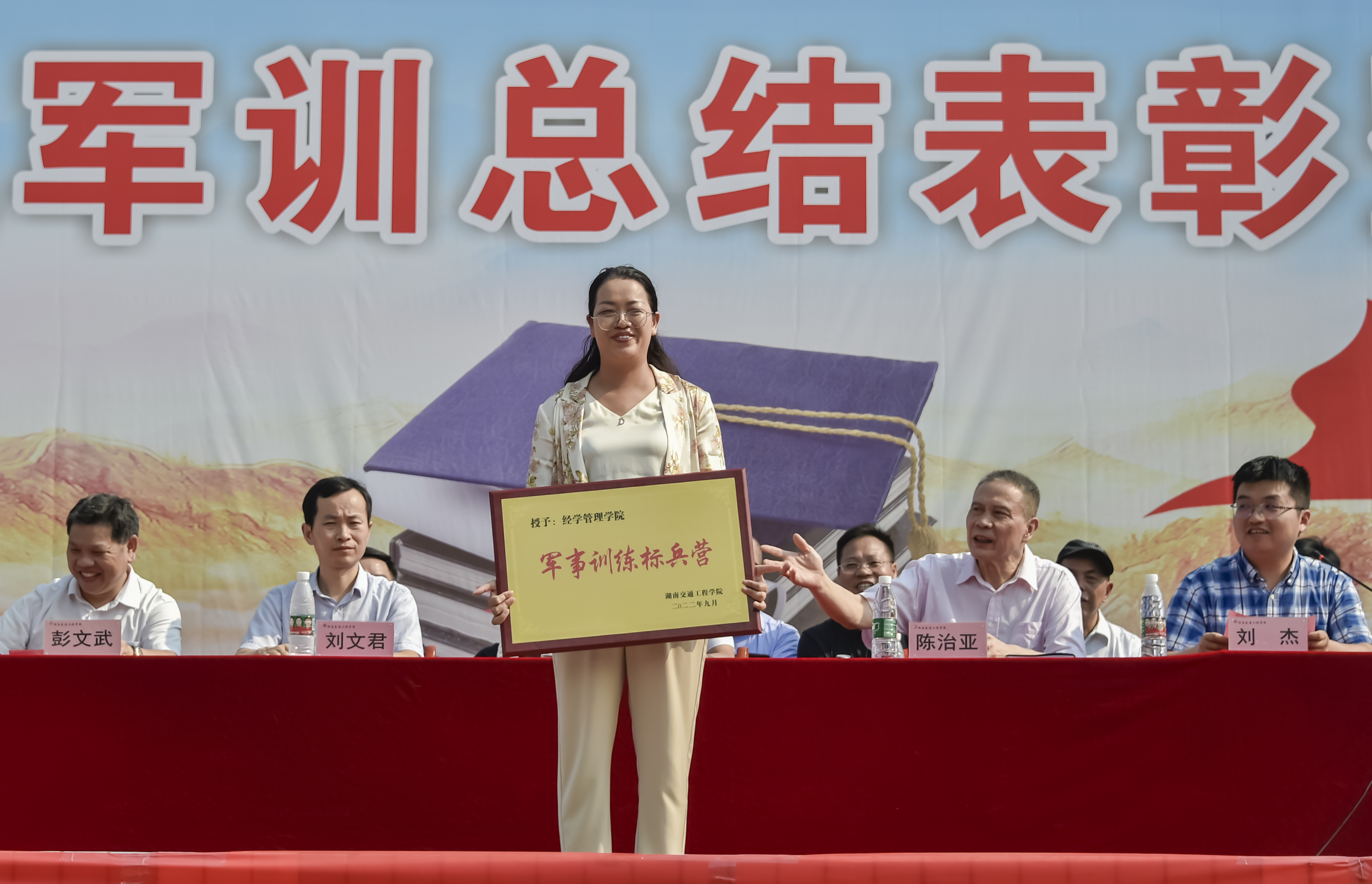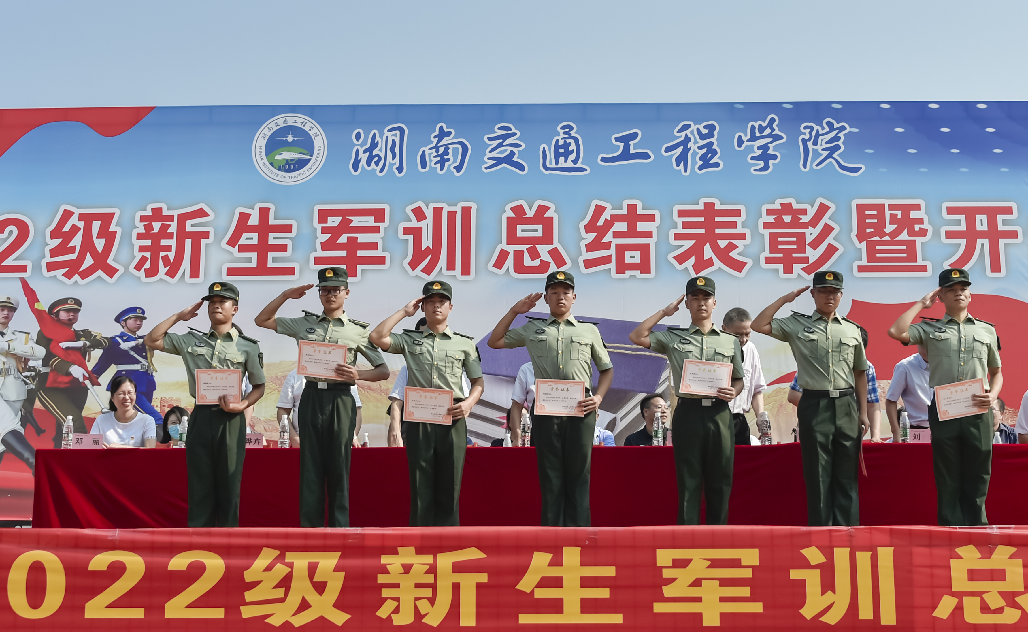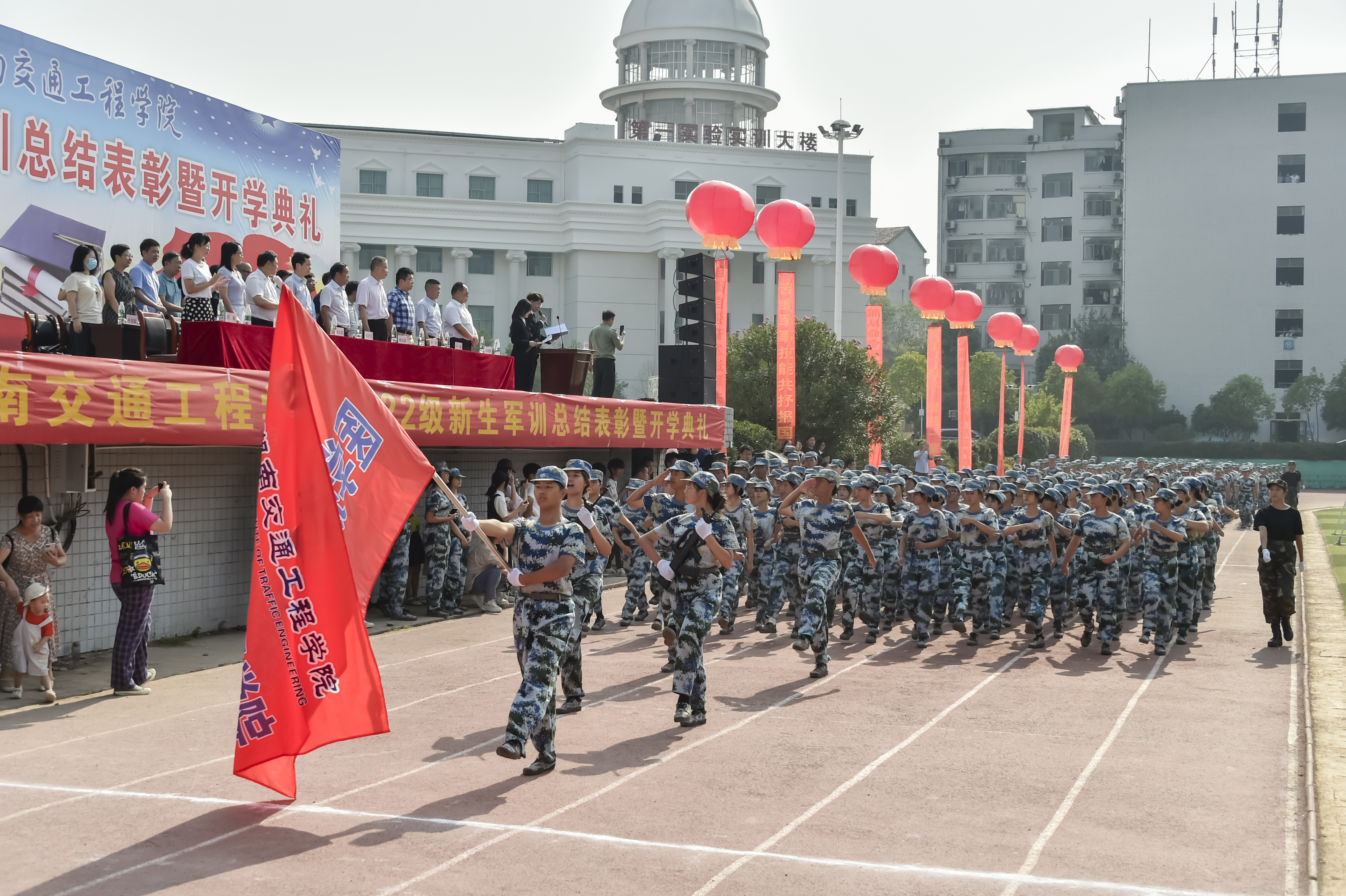 随着军训指挥员的一声口令,参加军训的2022级新生进行军事训练汇报表演,展示19天的军训成果。运动场内外一片恢弘之势,一场智慧与毅力相互碰撞的盛宴在交工院校园上演。