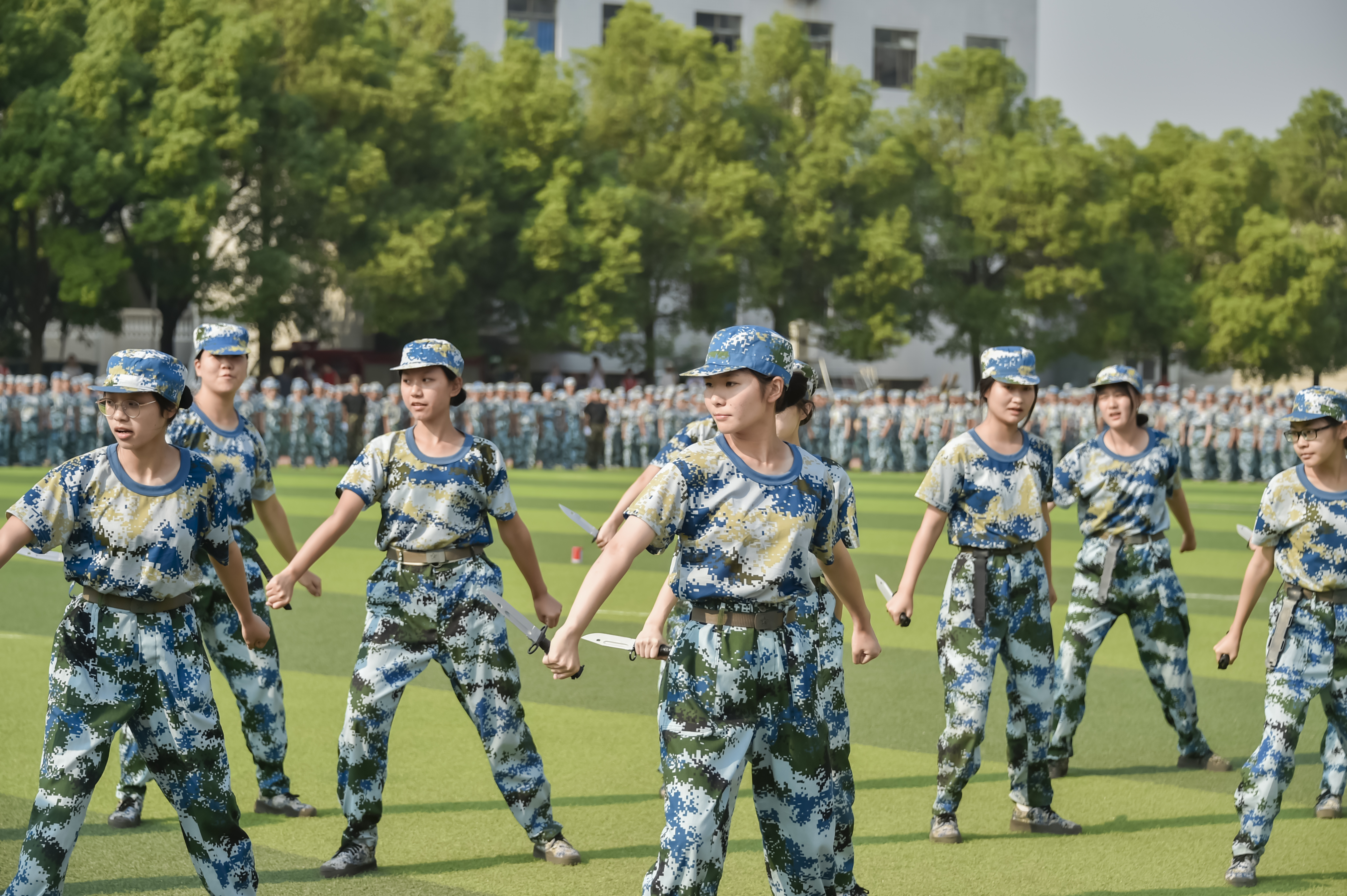 军事训练汇报表演分两步进行:第一步特色方阵表演,第二步分列式表演。在特色方阵表演中,医学技术与护理学院的一营表演《手语操》,电气与信息工程学院的五营表演《刺杀操》,经济管理学院的四营表演《匕首操》,机电工程学院的三营表演《擒拿格斗》,交通运输工程学院的二营表演《战术动作演示》,人文与艺术学院的六营表演了《我爱你中国》大合唱。各营表演各有特色,都有亮点。一声声铿锵有力的“嗨”,一个个刚劲勇武的拳腿,横踹侧踢、抱拳立定等动作行如流水,赢得军训队伍新生一片热烈喝彩。这铿锵有力、坚毅刚健的动作也展现了新时代大学生健康向上、积极奋进的精神面貌,诠释了“不负青春、不负韶华、不负时代”的初心使命。