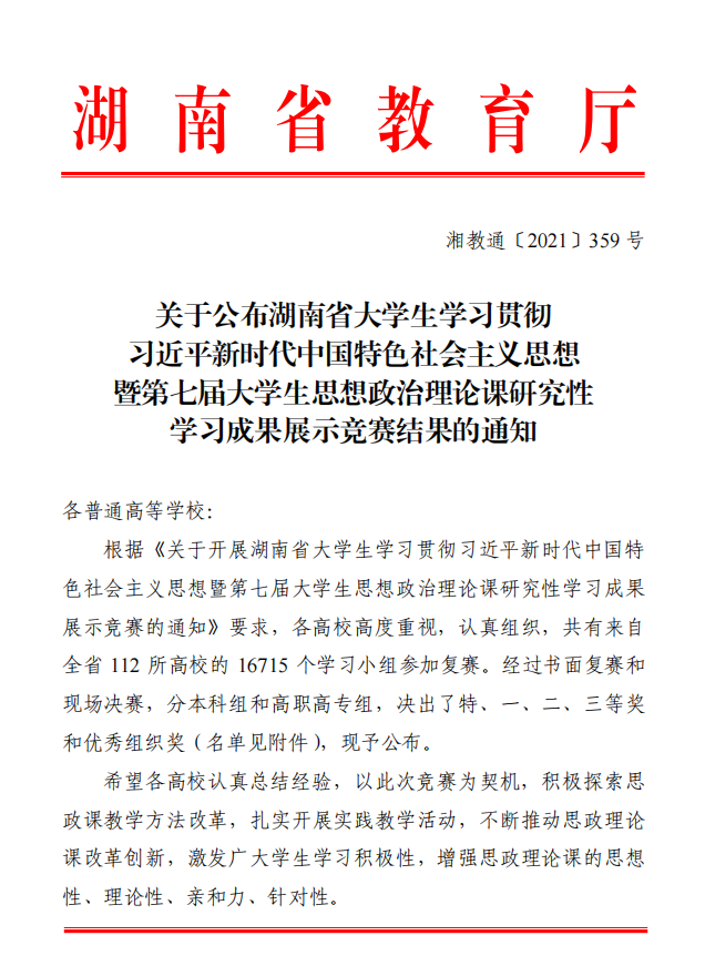 湘教通[2021]359号 关于公布湖南省大学生学习贯彻习近平新时代中国特色社会主义思想暨第七届大学生思想政治理论课研究性学习成果展示竞赛结果的通知(1).pdf
