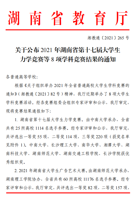 湘教通〔2021〕265号 关于公布2021年湖南省第十七届大学生力学竞赛等8项学科竞赛结果的通知